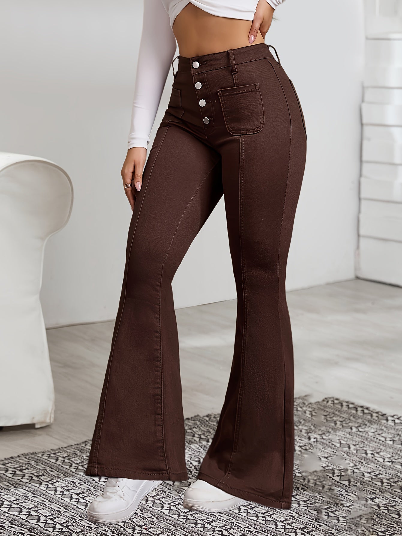 Jeans Femme Taille Haute – Évasé Café, Décontracté, Extensible, Boutons, Tous Saisons, Effet Usé