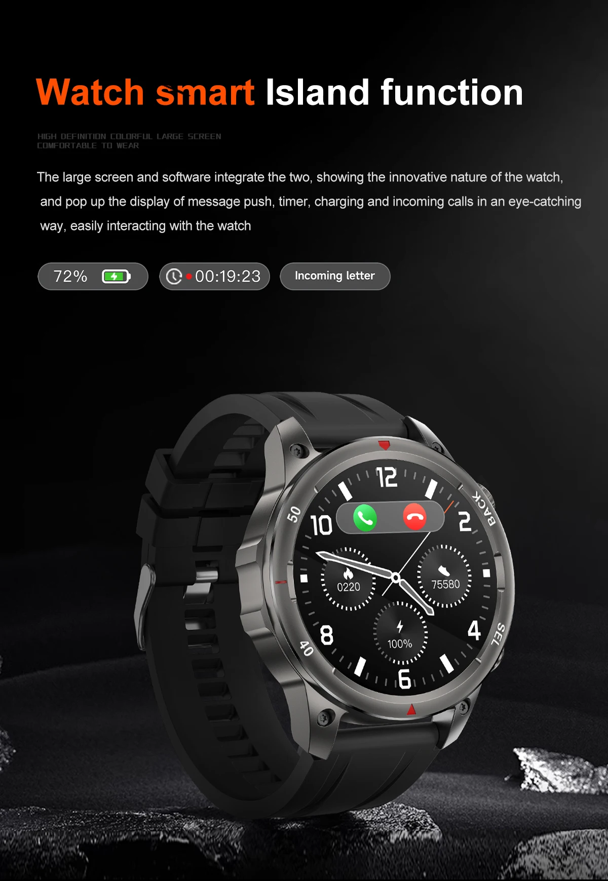 function: COMPASS,THERMOMETER,Calendar,Alarm Clock,Power Reserve,Remote Control,Countdown,Sleep Tracker,Speed Measurement,Fitness Tracker,Passometer,Call Reminder,Answer Call,Push Message,Mood Tracker,Message Reminder,Dial Call,Altitude Meter,Heart Rate Tracker,Calorie Tracker,Distance Tracker