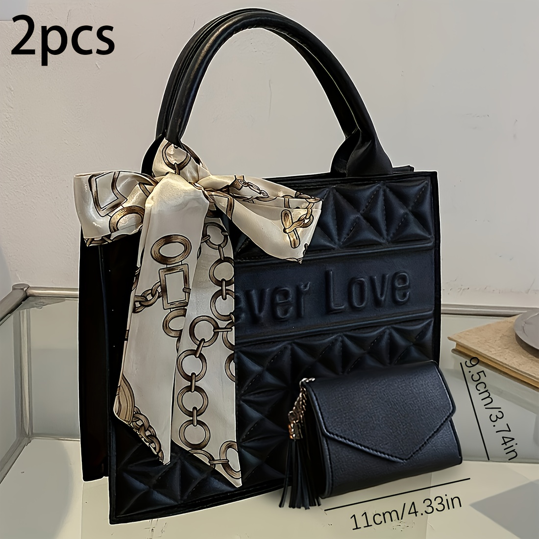 Set 2 Pièces Sac Carré à Motif Matelassé – Sac Cabas Grande Capacité, Sac à Épaule et Petit Portefeuille Assorti, Sac à Main Professionnel pour Femmes au Bureau