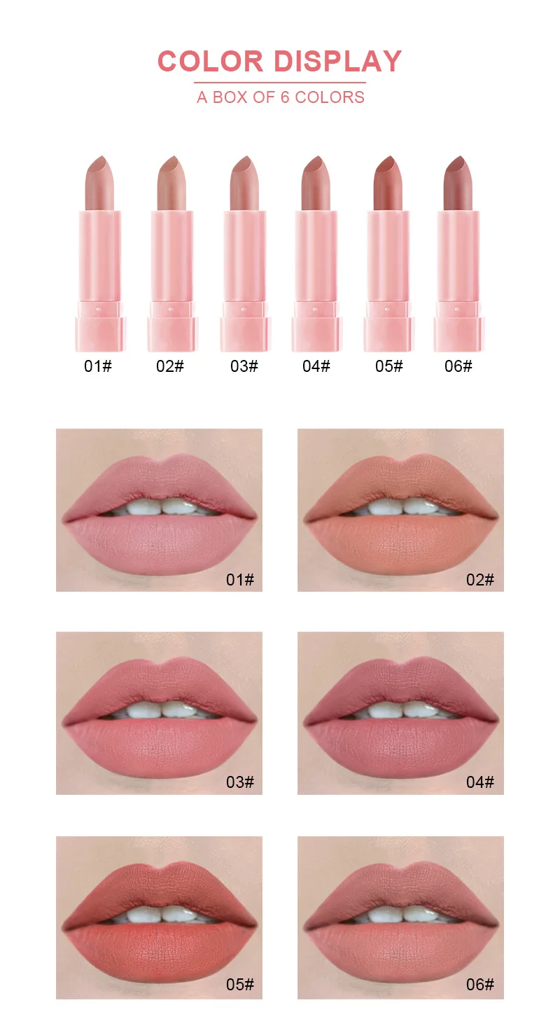 【Suitable for All Skin Tones】This 6-color matte lipstick set can blend different styles of makeup, the classic matte shade is suitable for all complexion tones, whether you are white skin, brown skin, black skin, all Can be easily controlled.