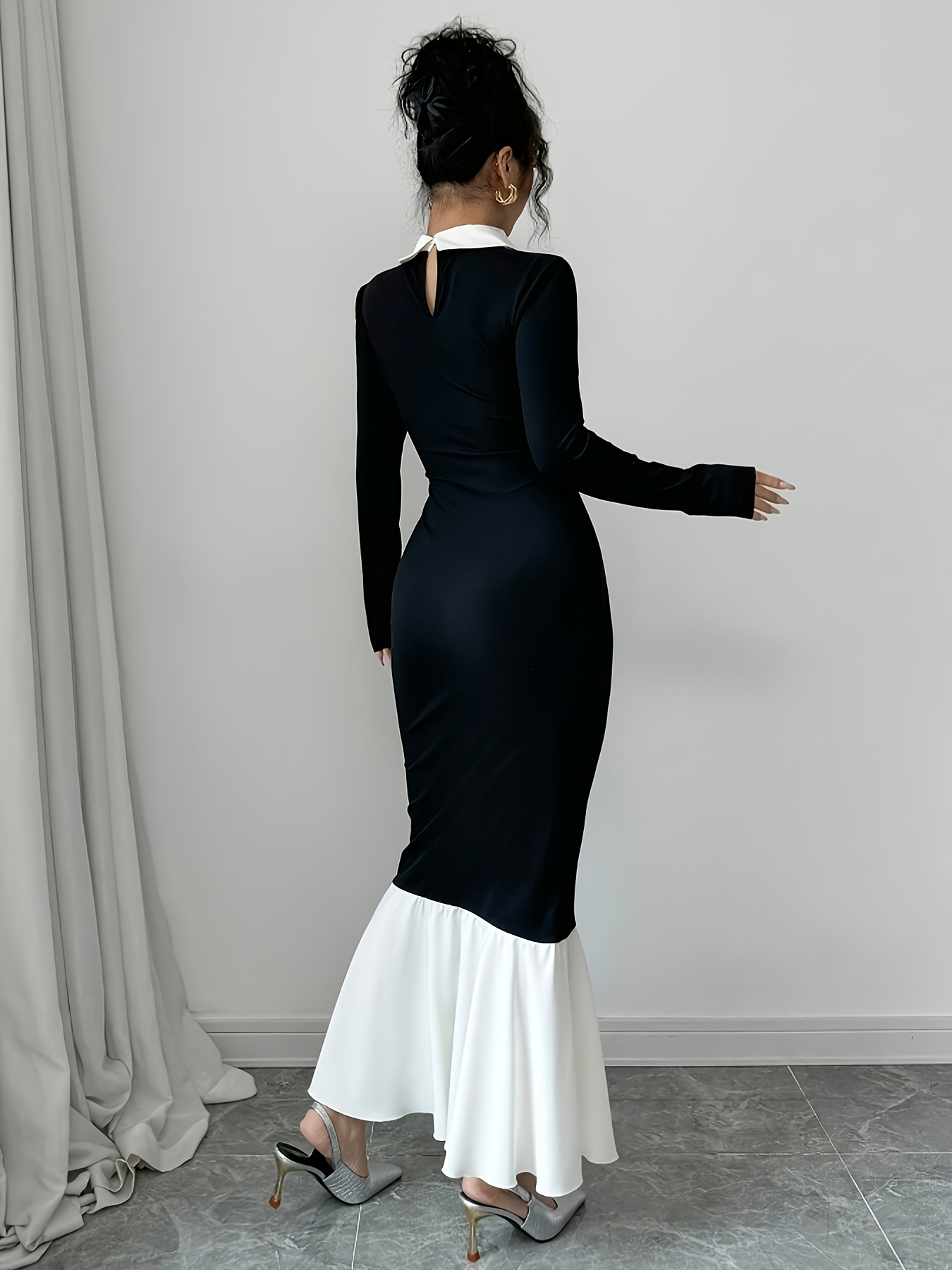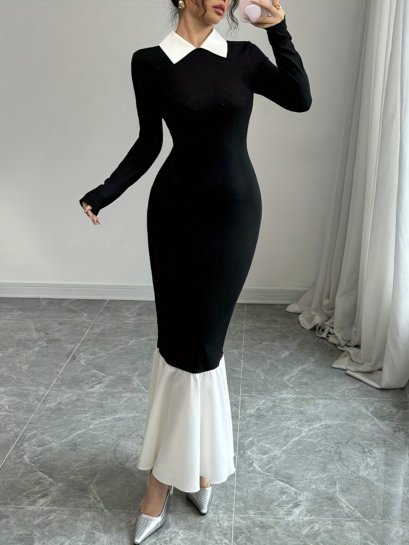 A Long-Sleeved Dress with a Shirt Collar, Featuring a Color-Blocking Design That Is Tailored to Create a Slim Silhouette, Perfect for Daily Commutes, Casual Outings, And Elegant Gatherings.