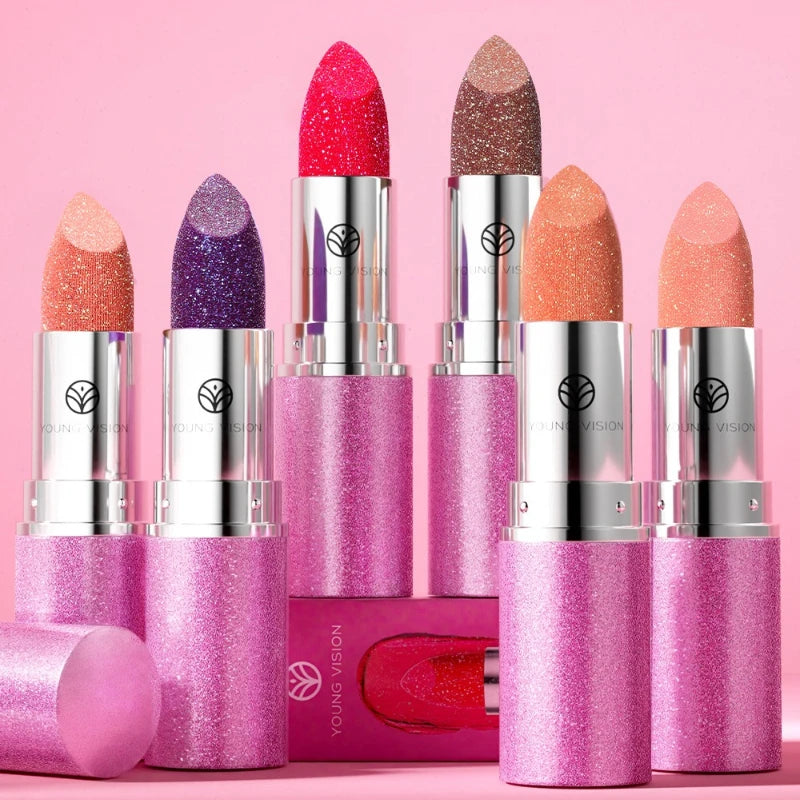 Delicate shimmer particles, like tiny diamonds or metallic luster embedded on the lips.