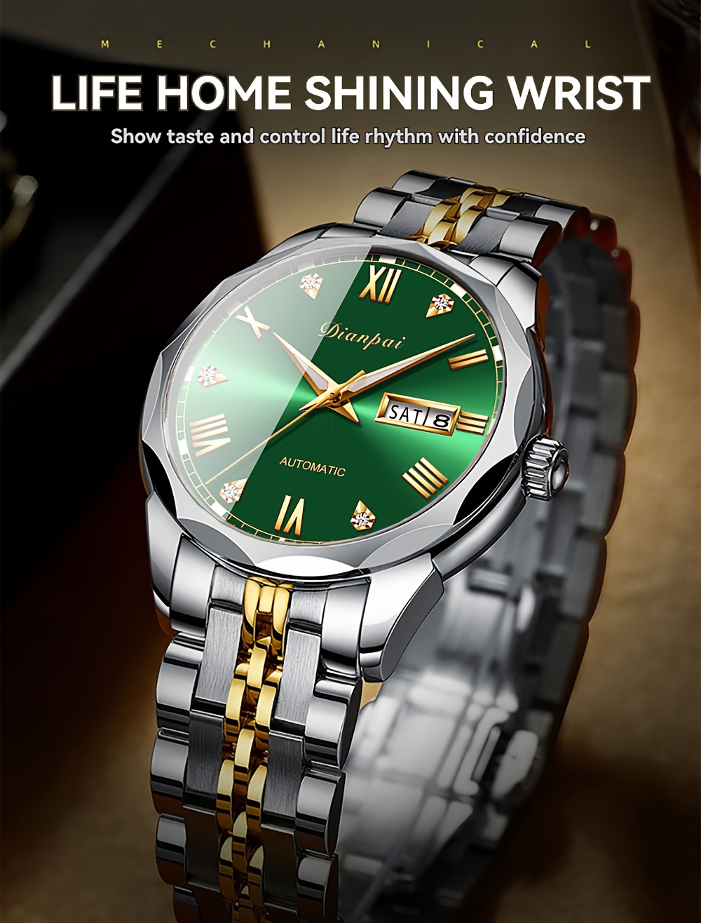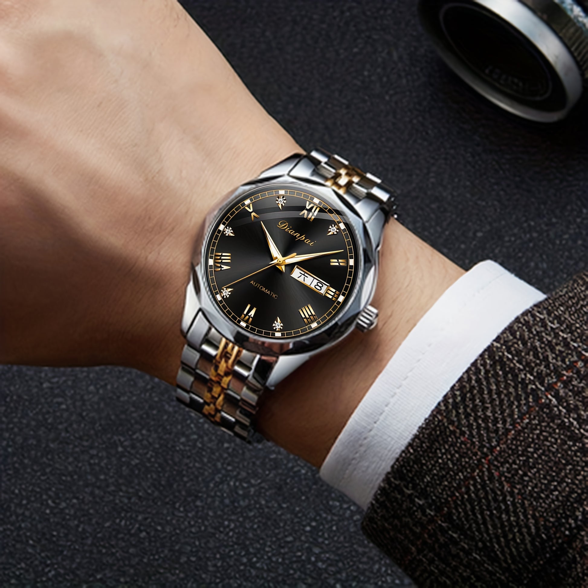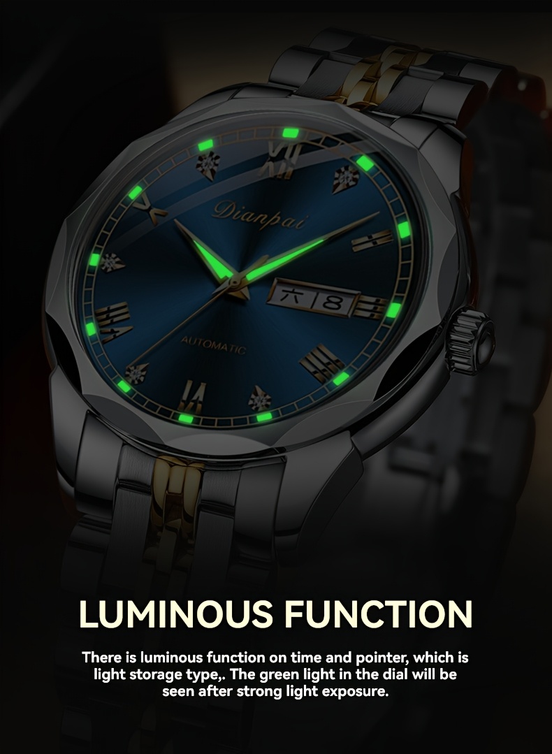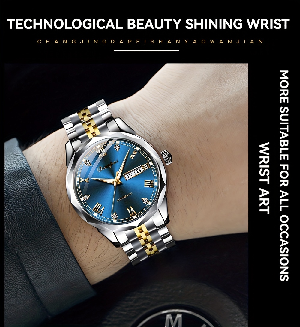 Luxury Men'S Fully Automatic Mechanical Watch with Luminous Calendar & Date Display - Stainless Steel Strap, Golden-Tone Dial, Business & Formal Wear, Without Battery, Formal Accessory, Professional Men, Stylish Men