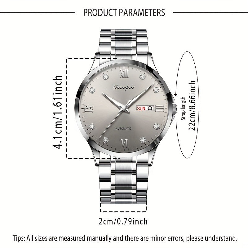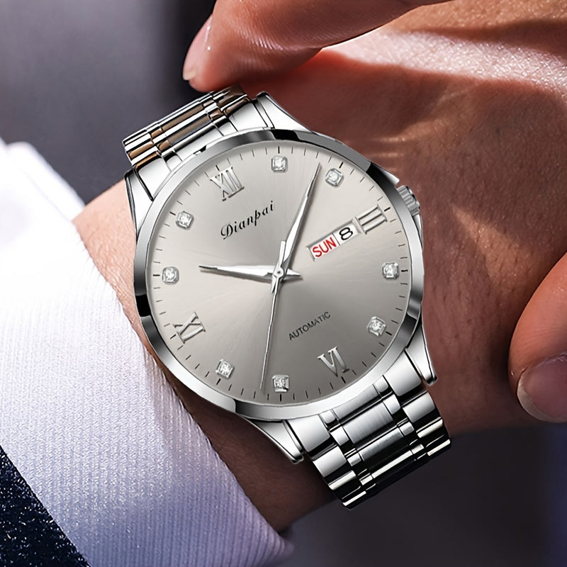 Men's Automatic Mechanical Watch Stainless Steel Luxury Rhinestone-Accented Dial Date Display Business Casual Wristwatch Gift for Him, Bling Watches, Formal Timepiece