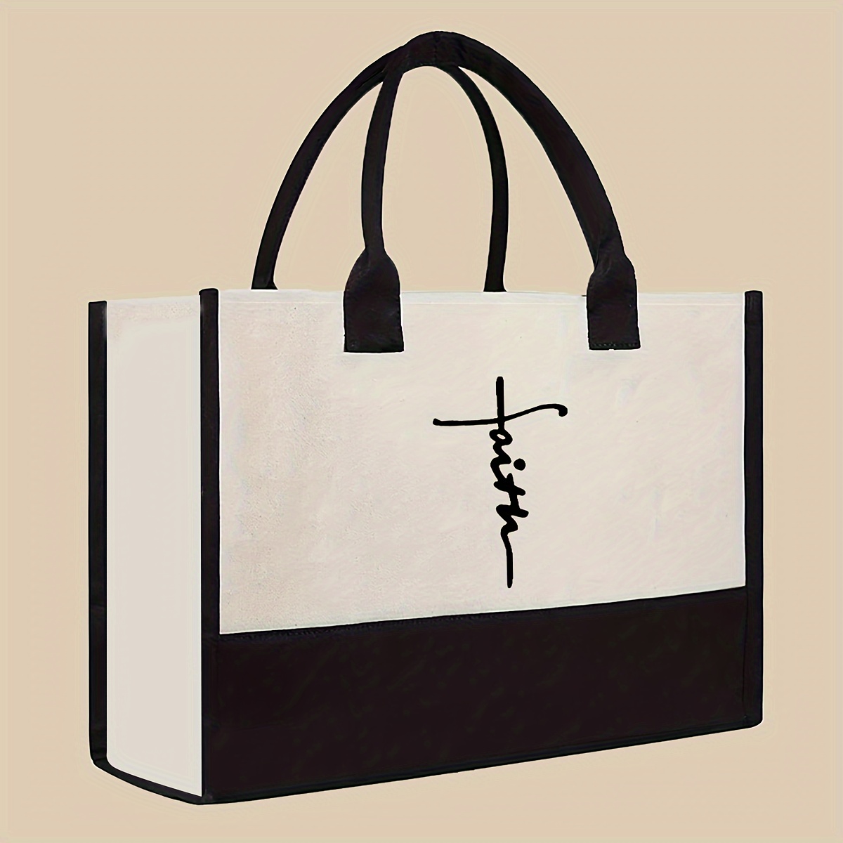 Sac Cabas « Faith » Grande Capacité – Toile Durable, Design Bicolore (Noir/Blanc), Intérieur Spacieux, Bandoulières Fixes, Idéal pour Shopping, Voyages et Cadeaux | Sac Noir Élégant | Poignées Solides