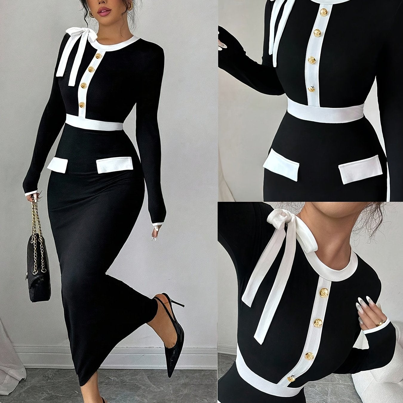 Elegant Fashion New Women'S Long Sleeve Bodycon Dress | Black and White Color Block, Sleek Contour, Crew Neck, Long Length