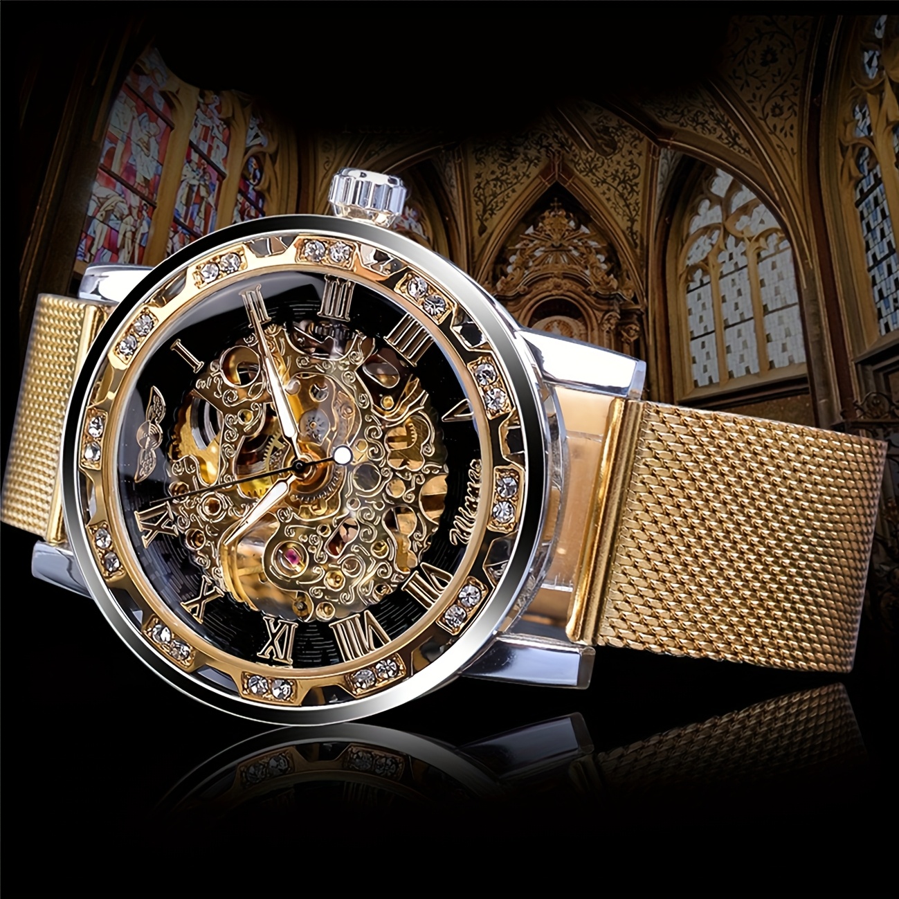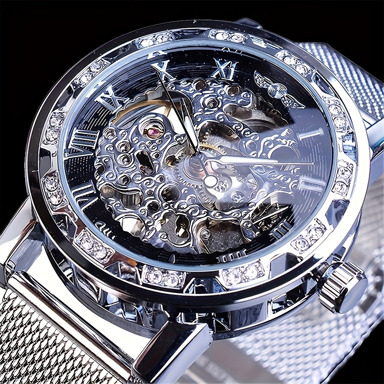 Elegant Men'S Mechanical Watch with Rhinestone Accents & Hollow Mesh Band - Stainless Steel, Zinc Alloy Case, Business Style, Self-Winding Movement, Pointer Display, No Battery Needed, Business Watch | Elegant Watch | Durable