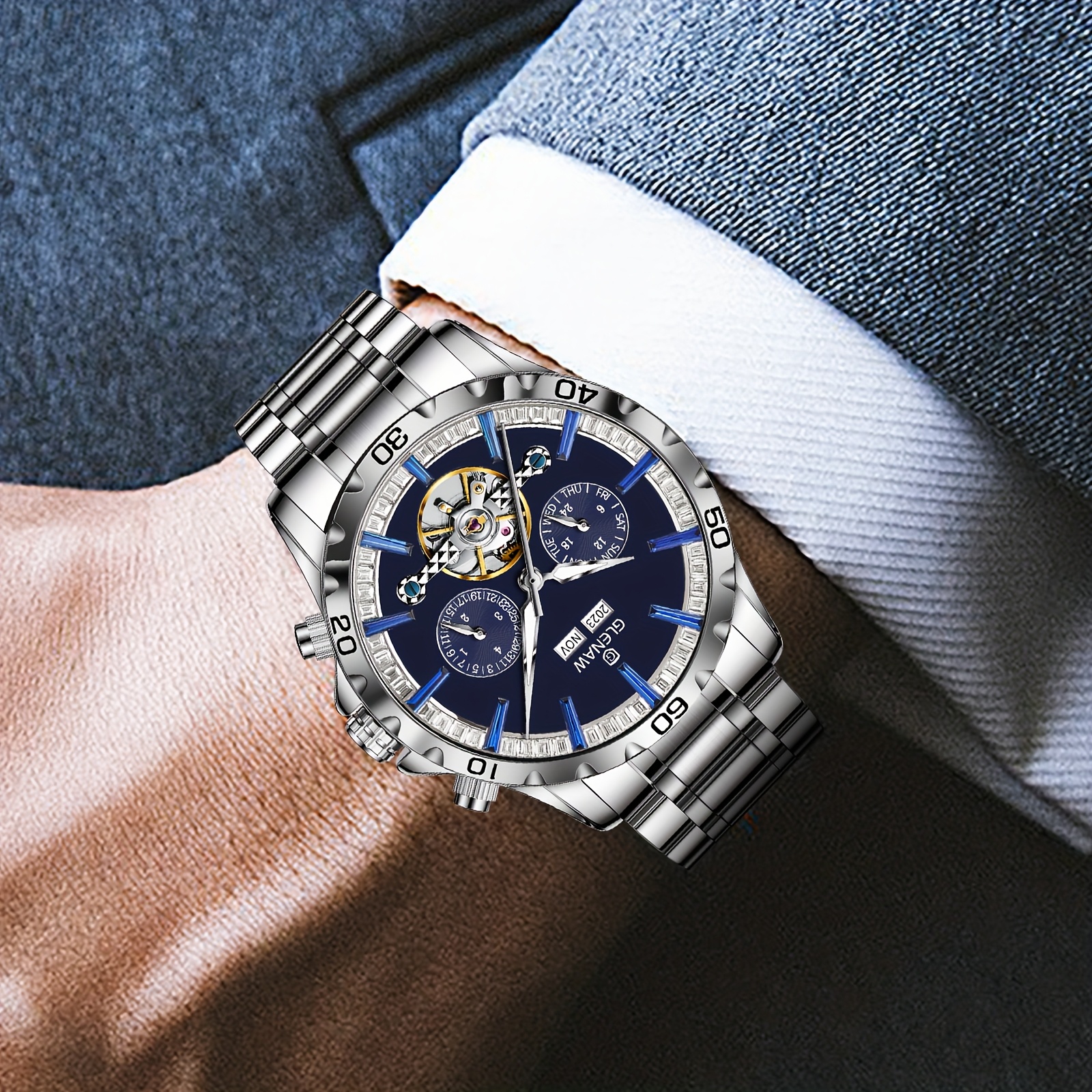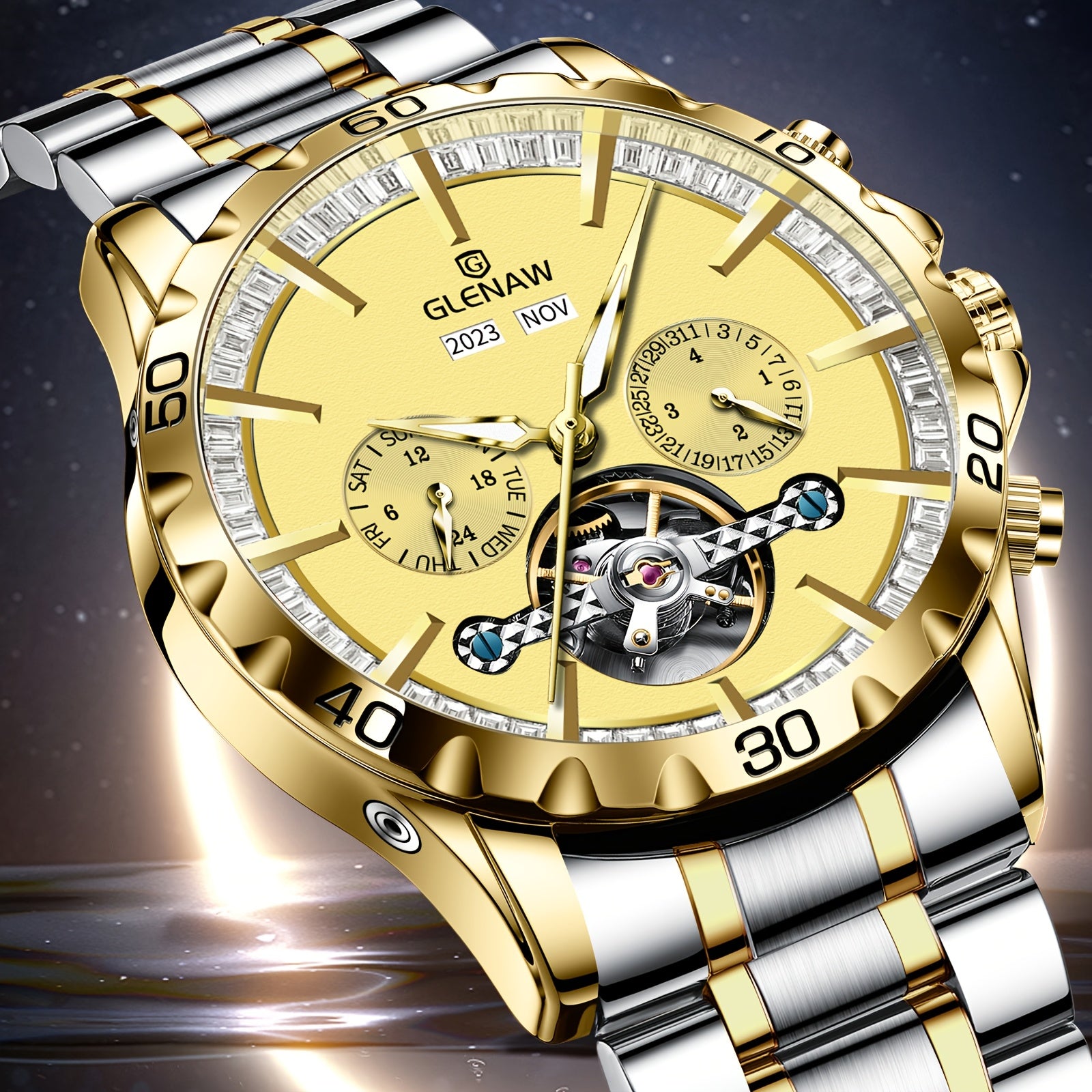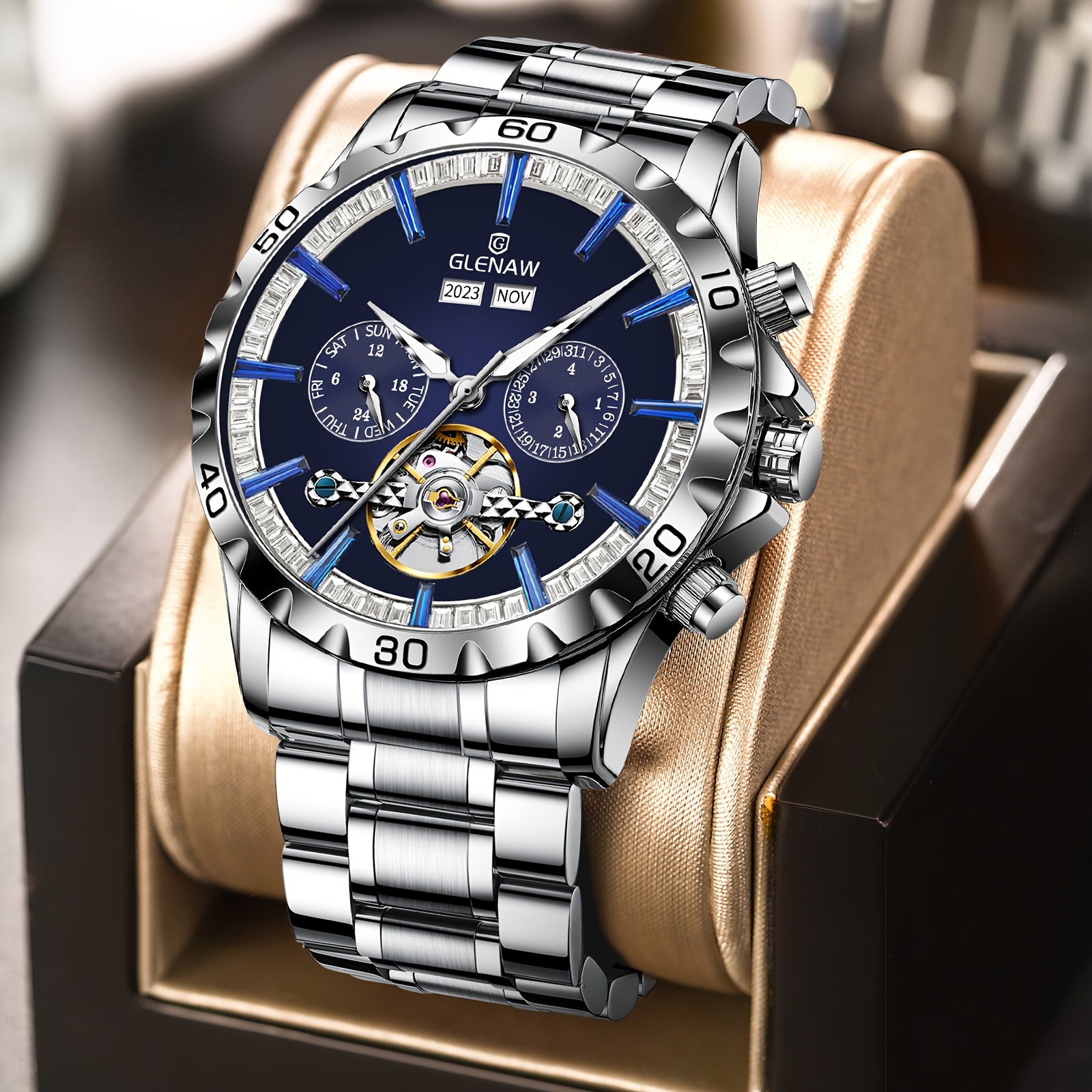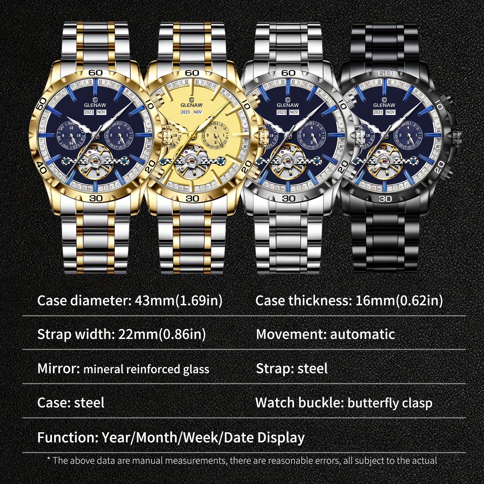 GLENAW Men's Automatic Mechanical Watch - Luxury Blue Dial with Golden accents, Date Display, Elegant Watch for Formal & Casual Attire - Ideal Gift for Men, Stylish Wristwatch, Sophisticated Timepiece, Highend Craftsmanship