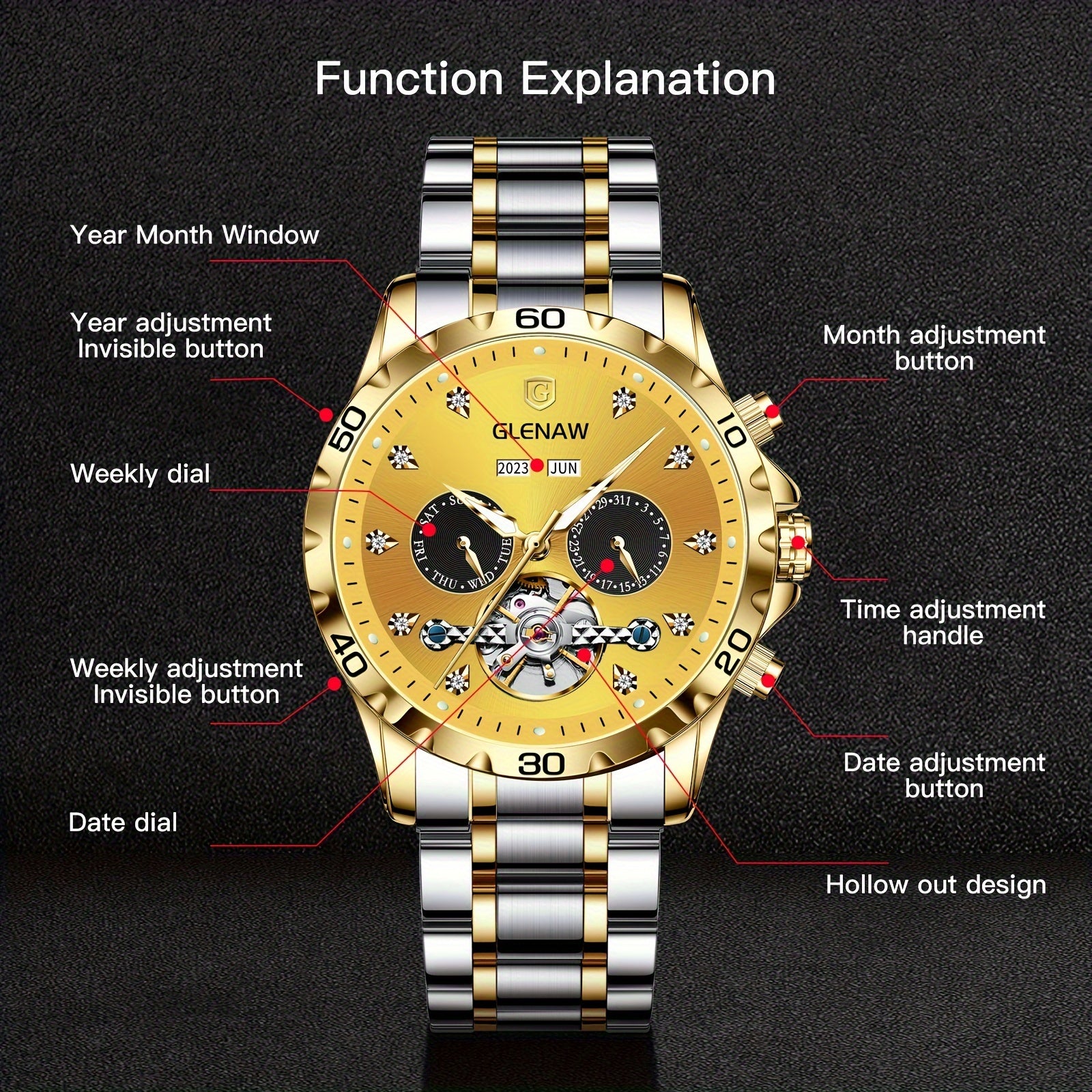 Montre automatique pour homme, bracelet en acier inoxydable avec strass, montre mécanique squelette à remontage automatique avec affichage du jour, de la date, du mois et de l’année – Cadeau idéal pour homme