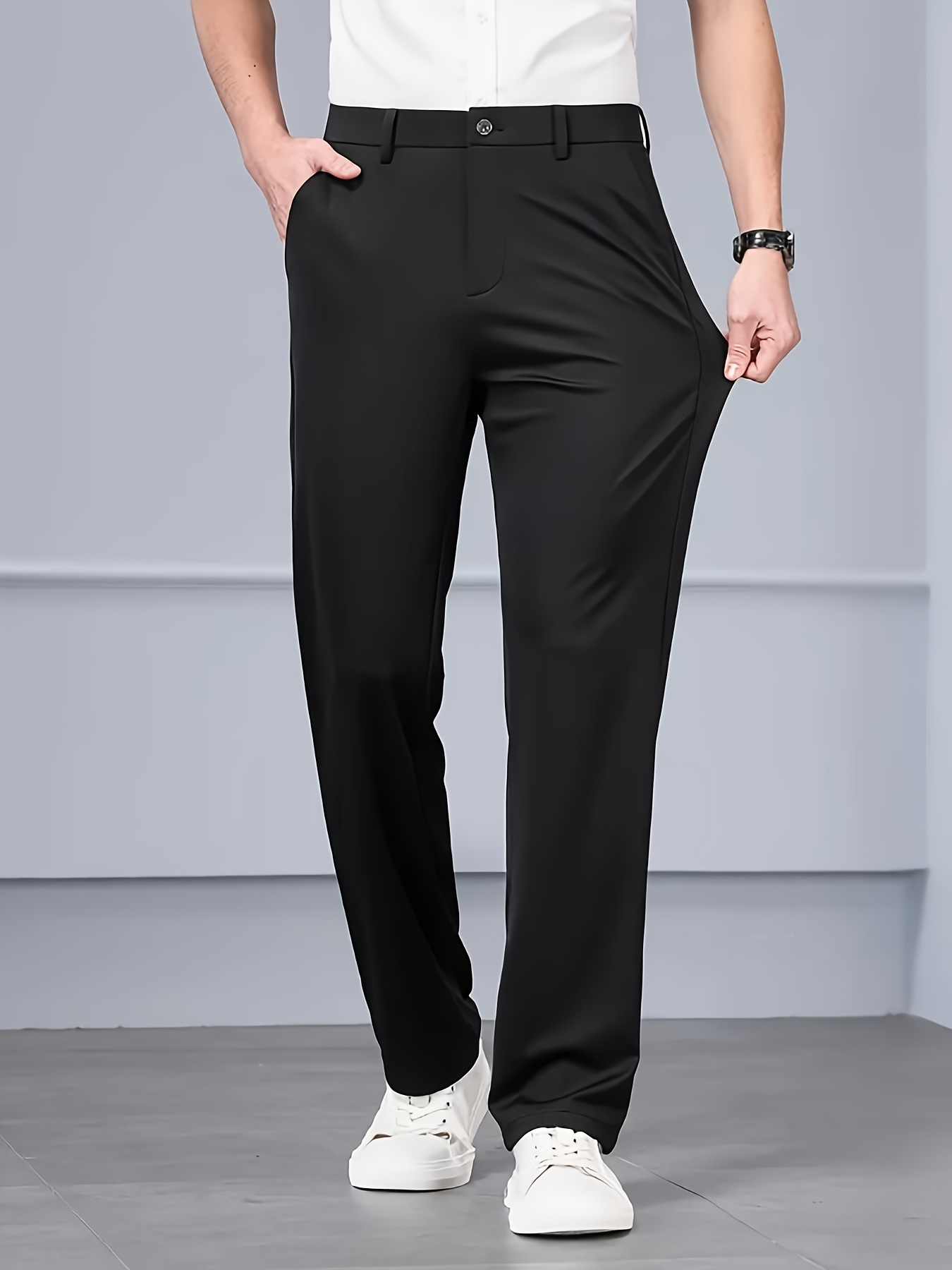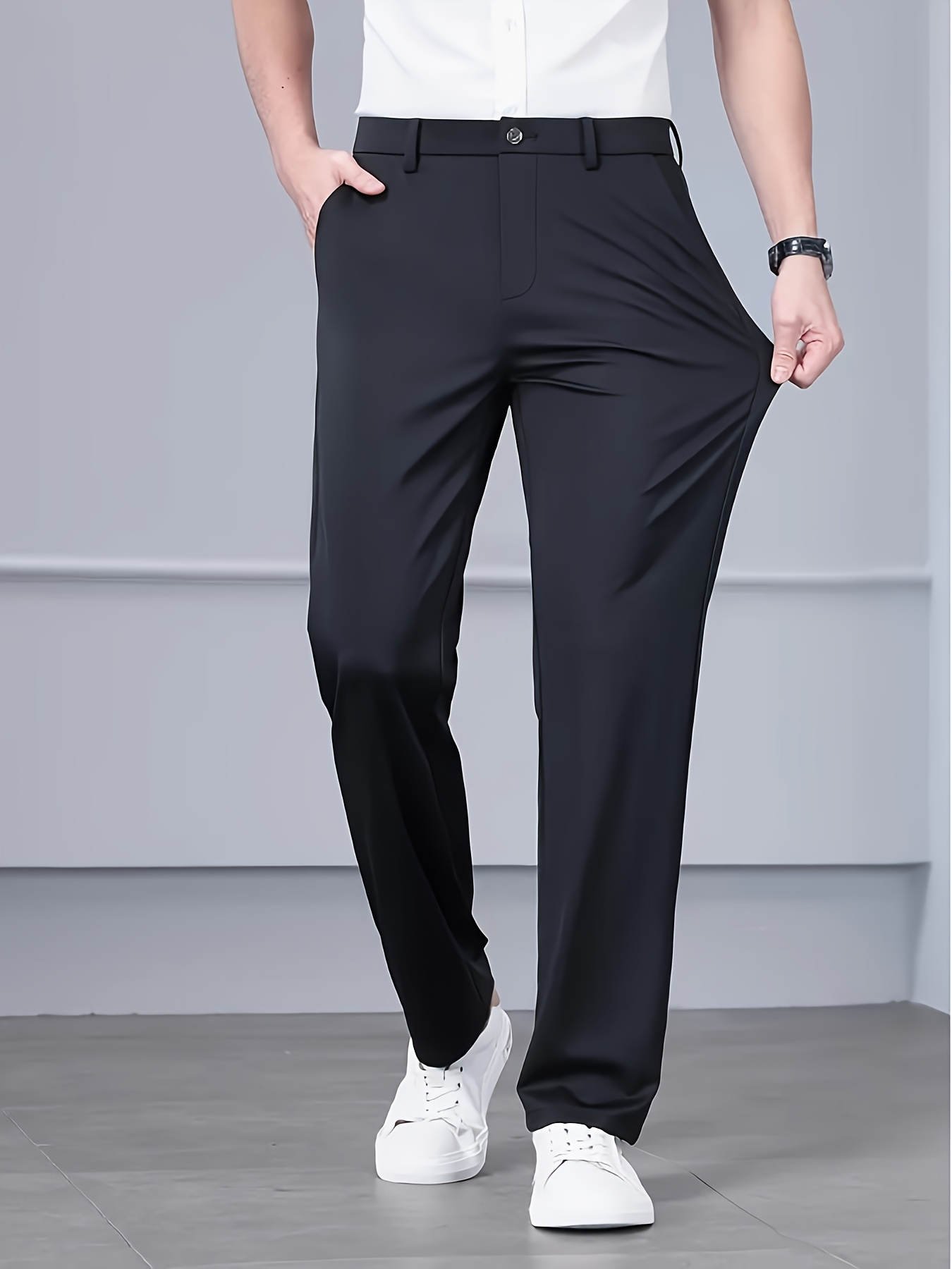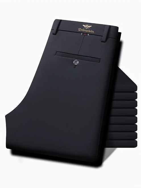 Pantalon habillé infroissable et extensible pour homme – noir, toutes saisons, décoration subtile, taille élastique sans ceinture, coupe droite, idéal bureau, mariage et tenue professionnelle, lavable en machine