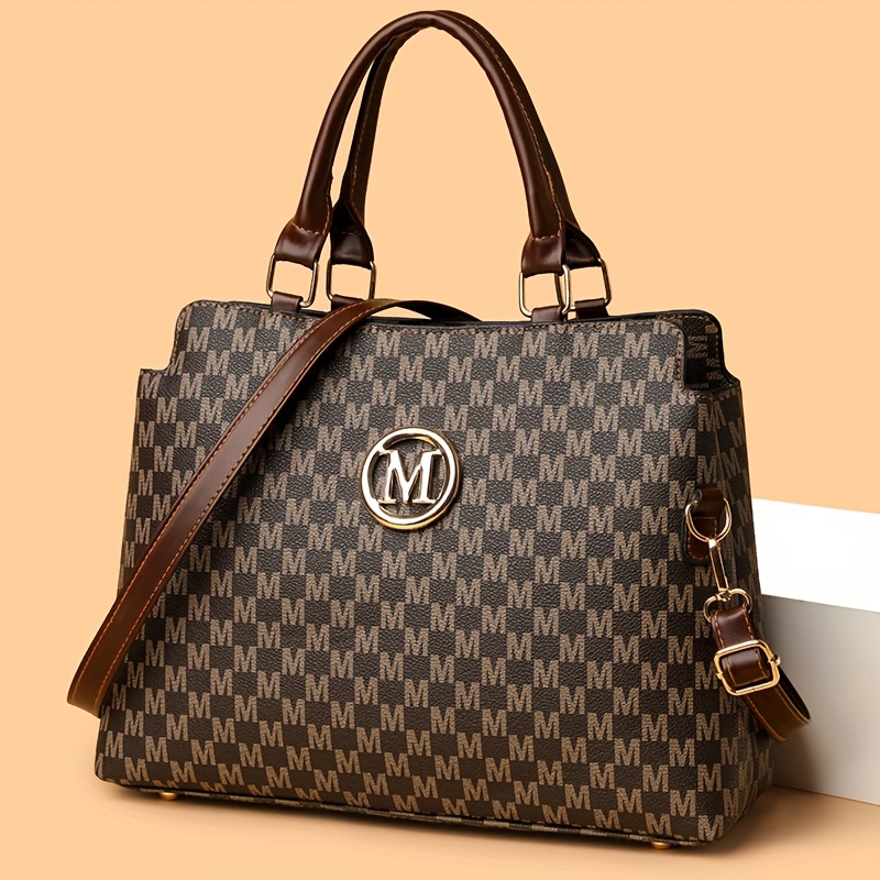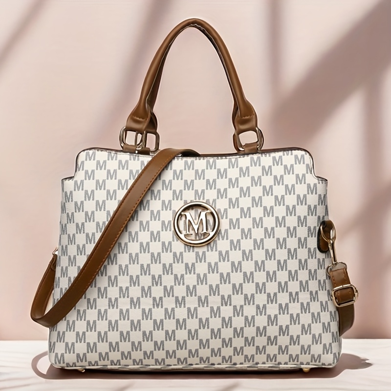 Sac rétro Pied-de-poule femmes blanc et marron logo doré M bandoulière réglable élégant