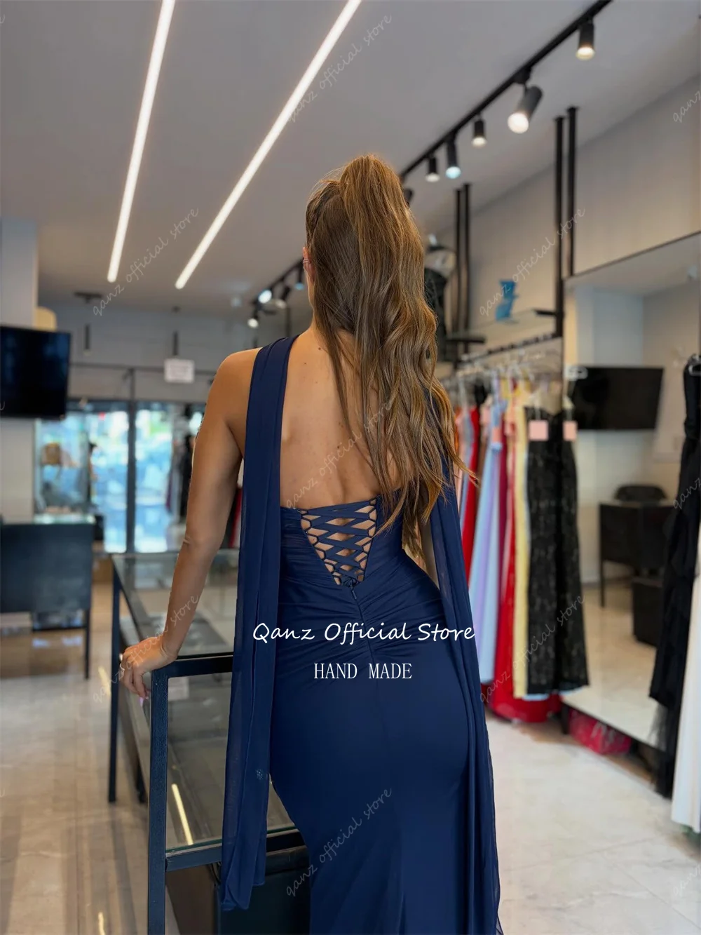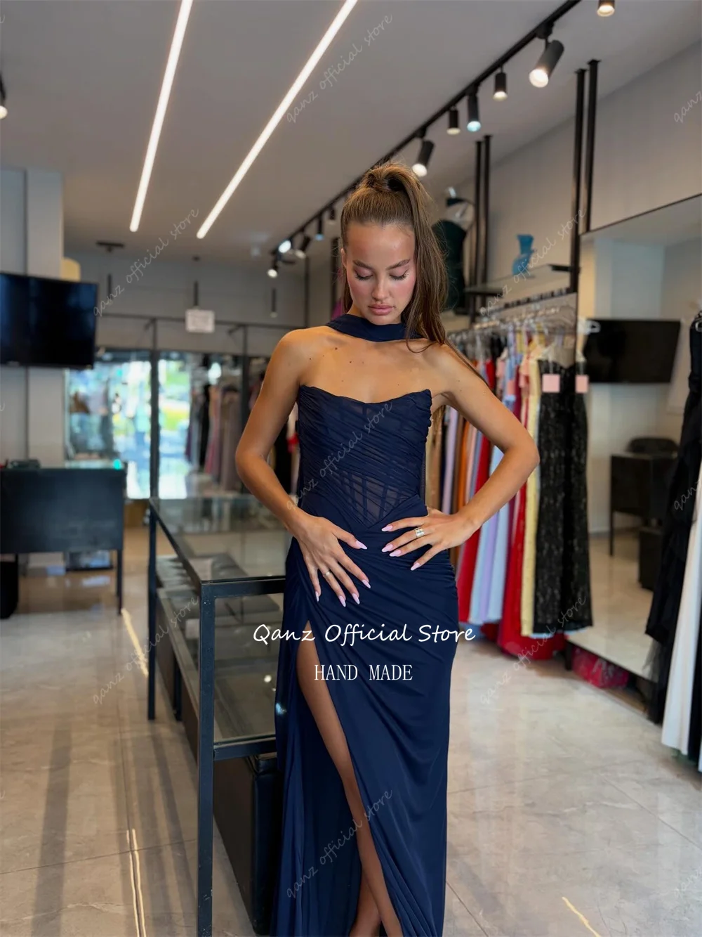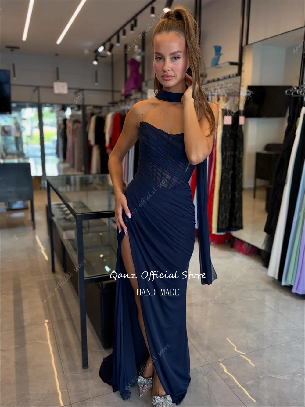 Qanz Nave bleu Robes De Soirée sirène haute fente latérale en mousseline De soie Robes De Soirée dos nu Corset élégant fête femmes personnalisé