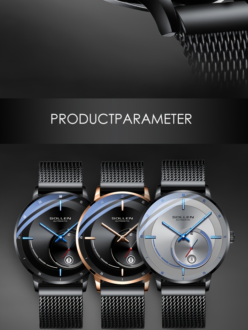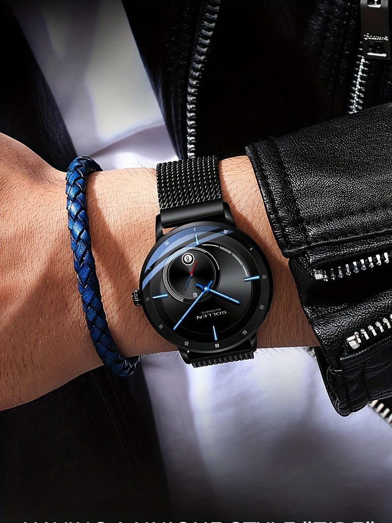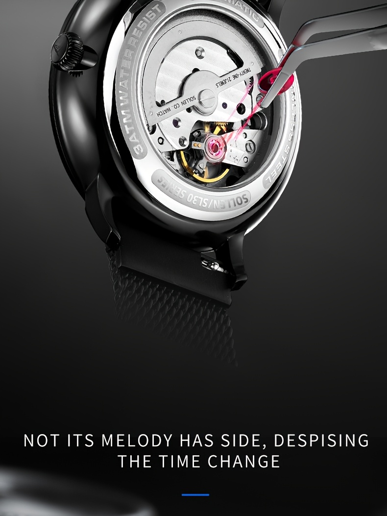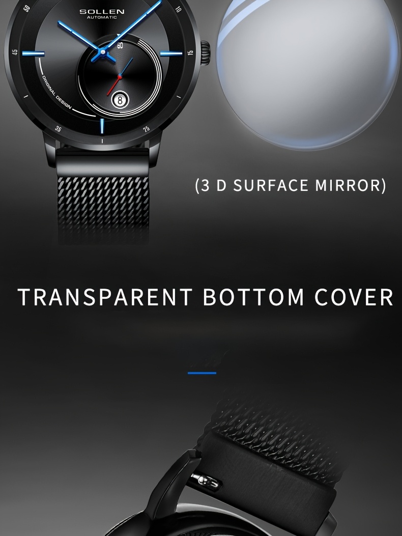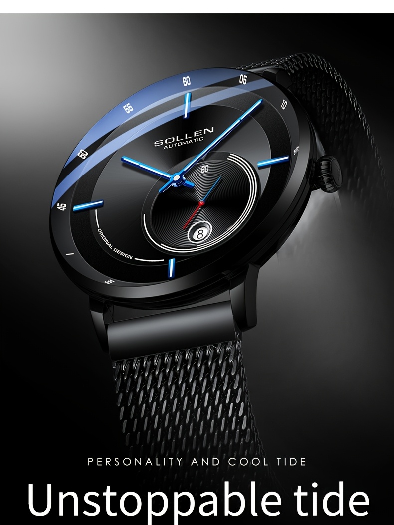 SOLLEN Men'S Automatic Mechanical Watch with Luminous Hands, Date Display & Calendar - Stainless Steel Strap, Skeleton Design, Mechanical Movement - Ideal for Birthdays, Valentine'S Day, Father'S Day, Wedding Anniversary Gift