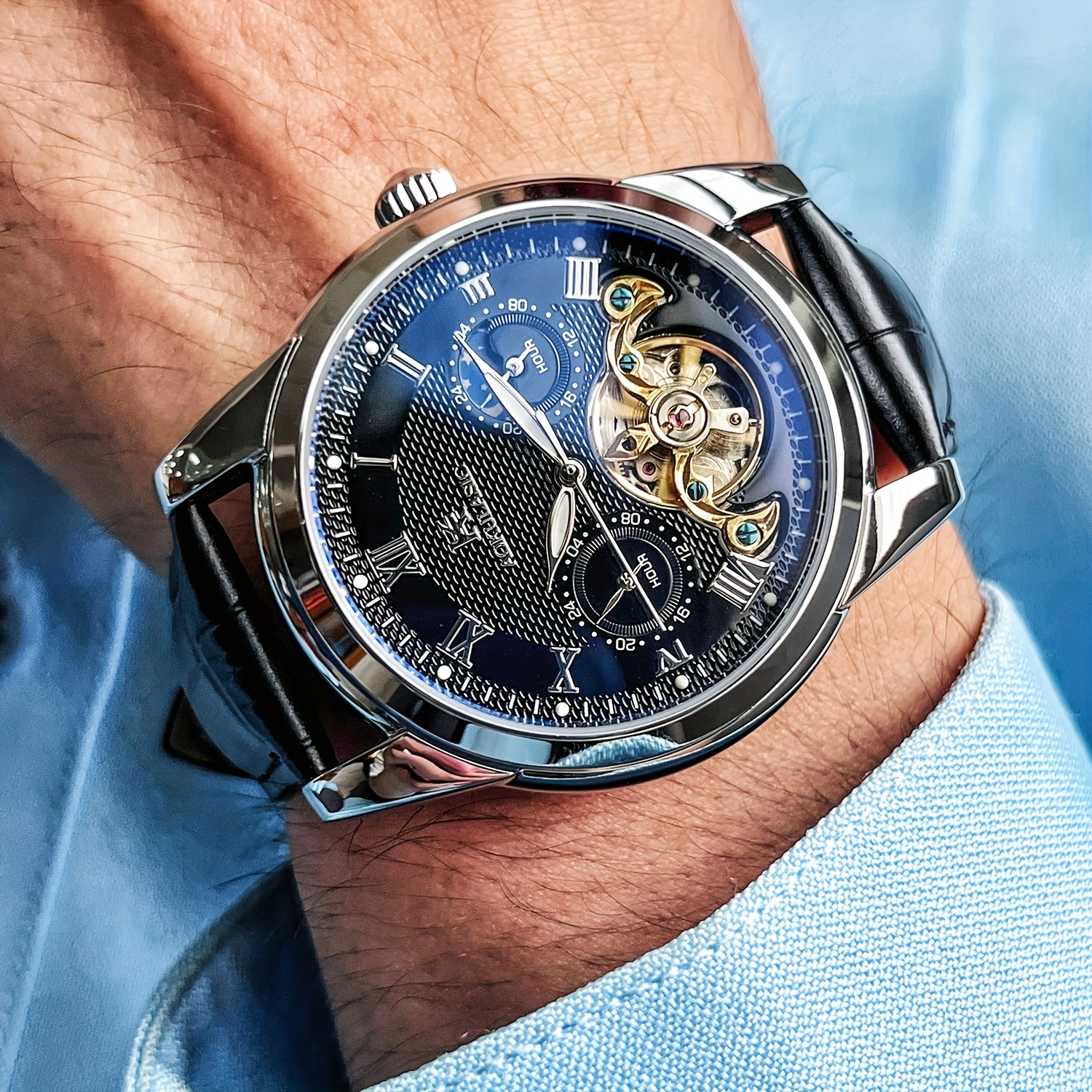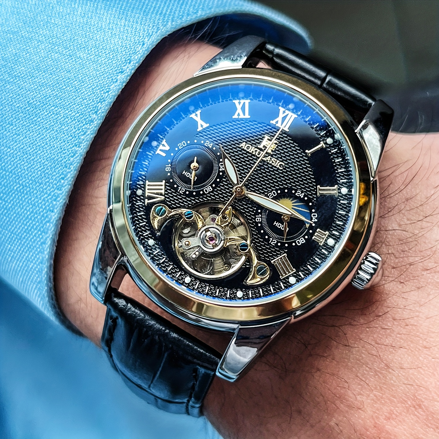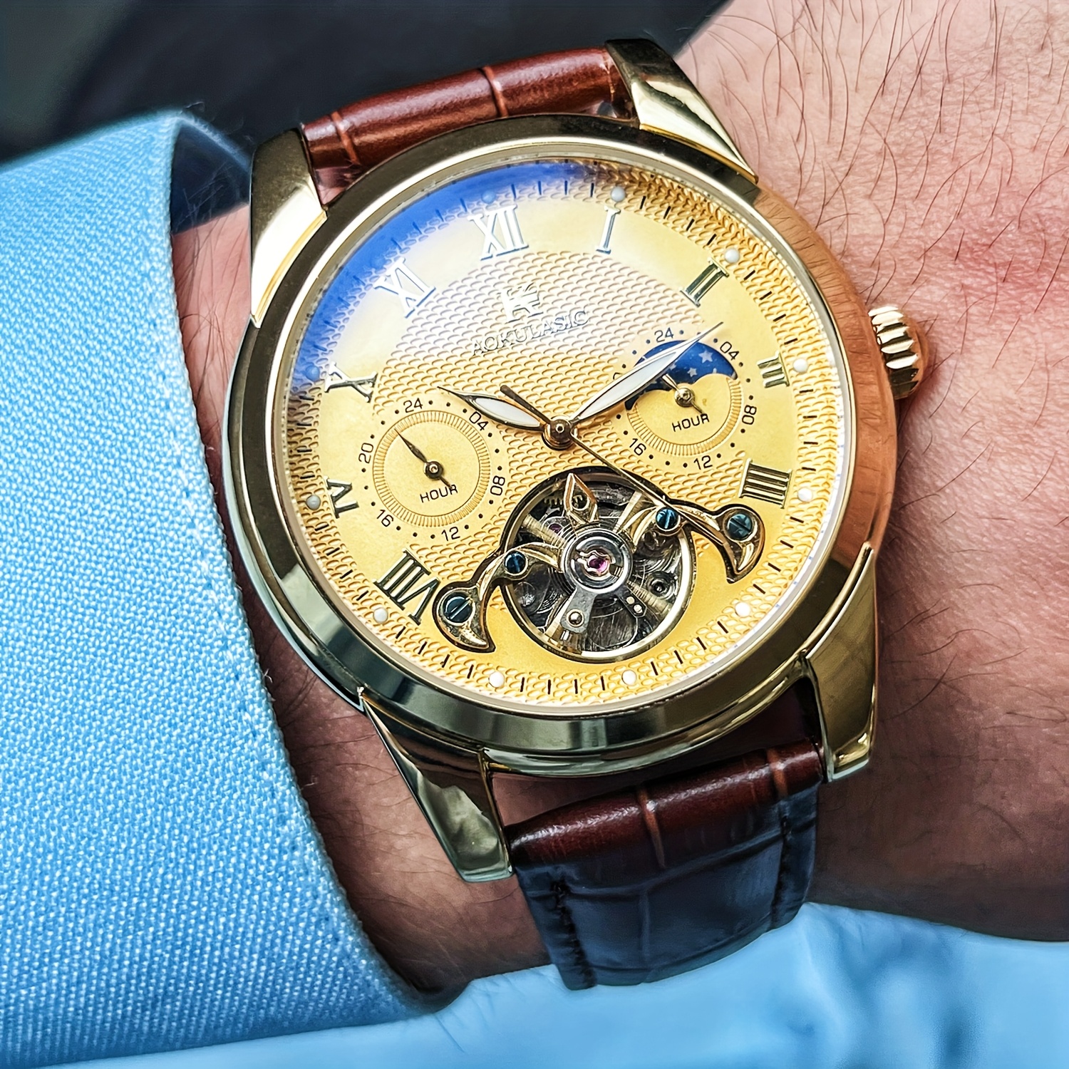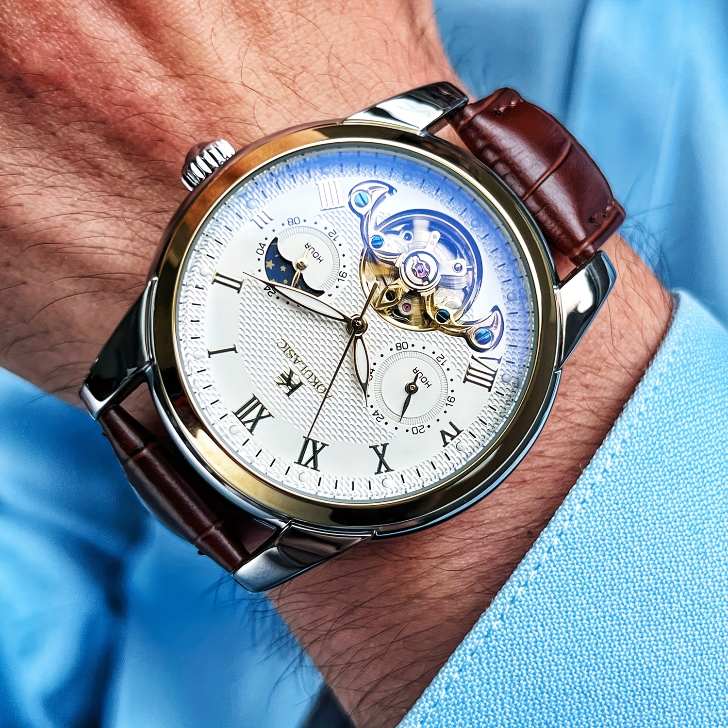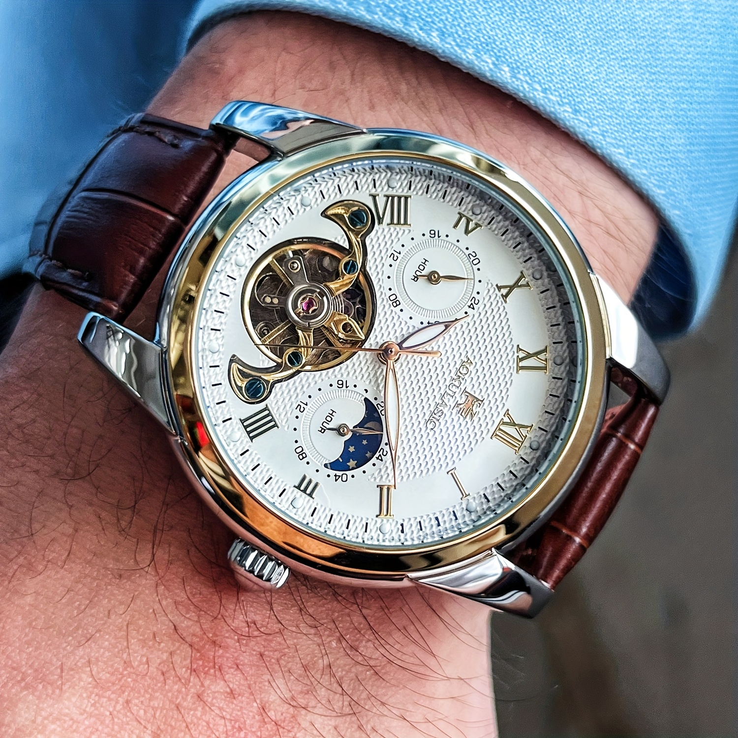 Luxury Automatic Mechanical Watch for Men - Fashionable and Versatile Casual Style - Light Luxury High-end Sun, Moon, Stars 24-Hour Function - Automatic Winding Luminous Hands - Business Demeanor Style - Gift for V