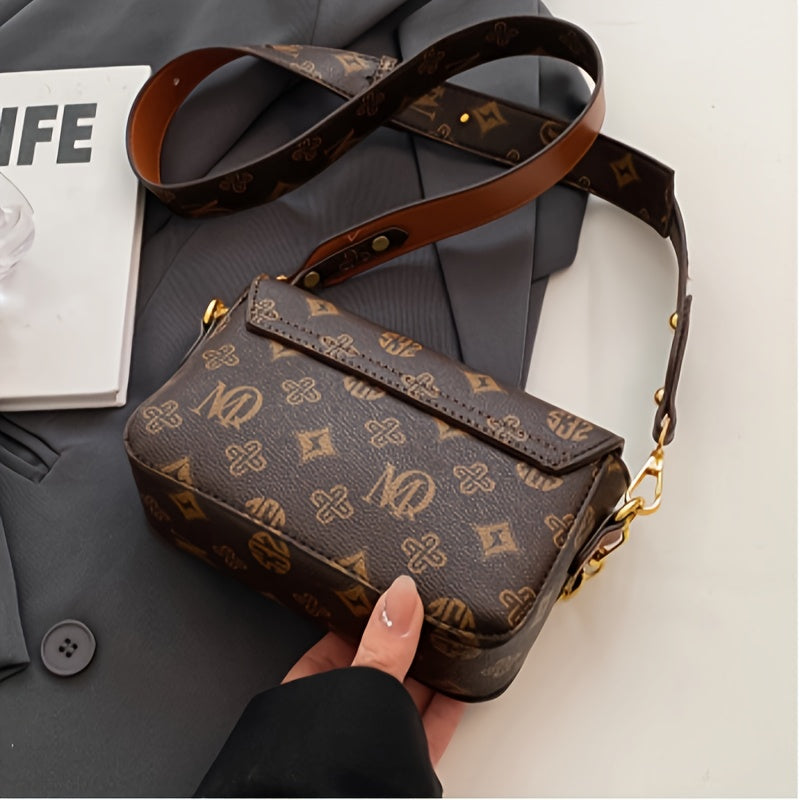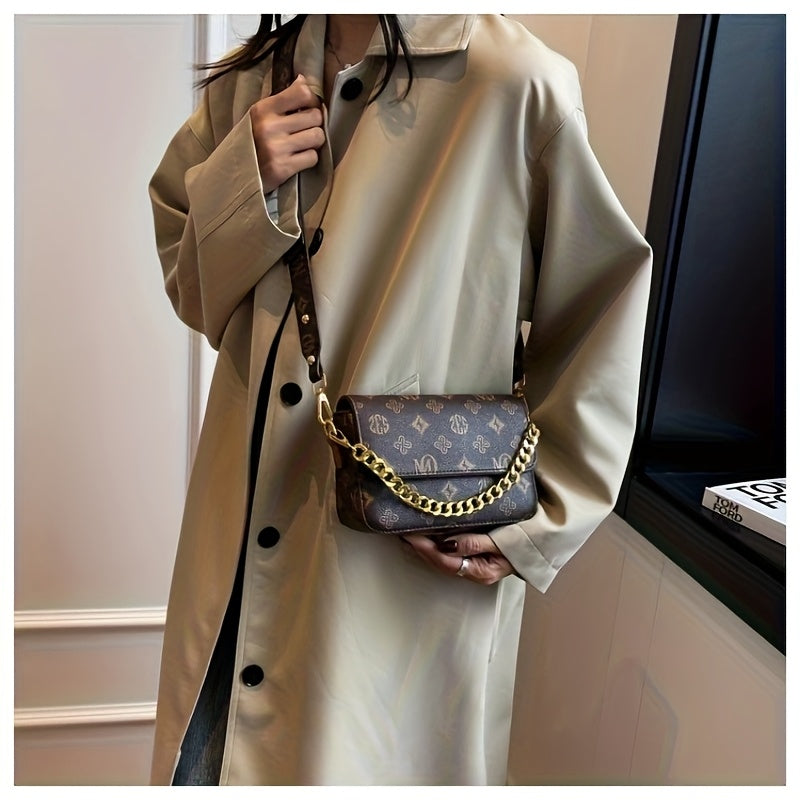 Sac bandoulière femme marron café – chaîne dorée, fermeture à boucle réglable, petit sac carré pour trajets, usage décontracté ou professionnel, accessoire élégant et pratique