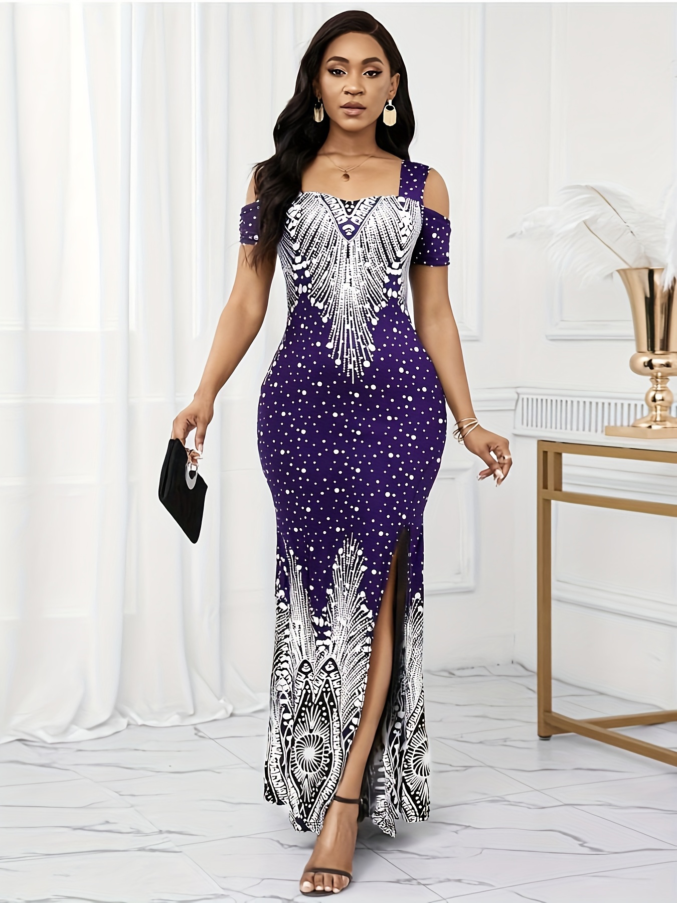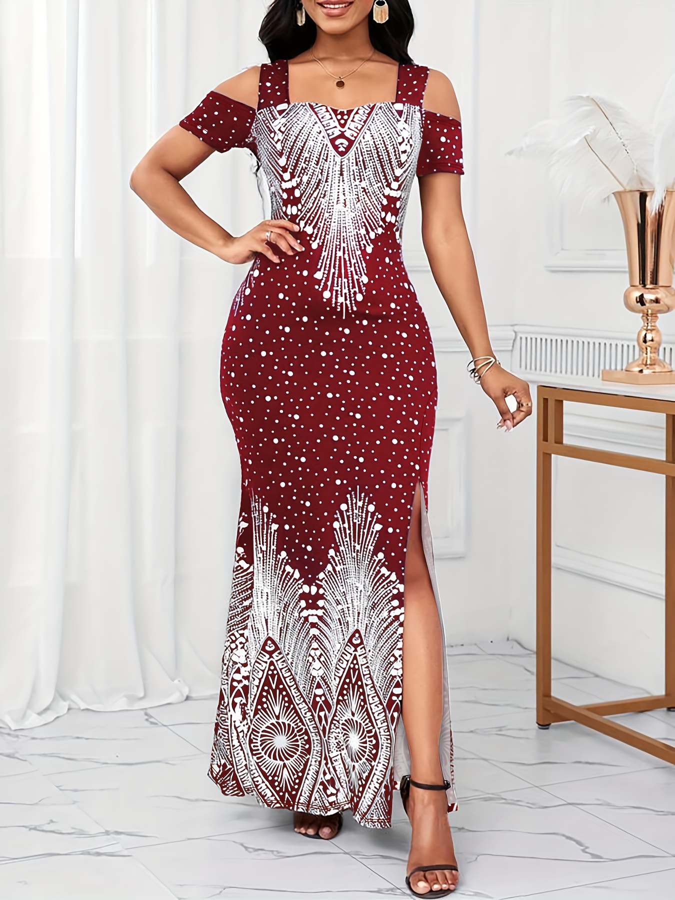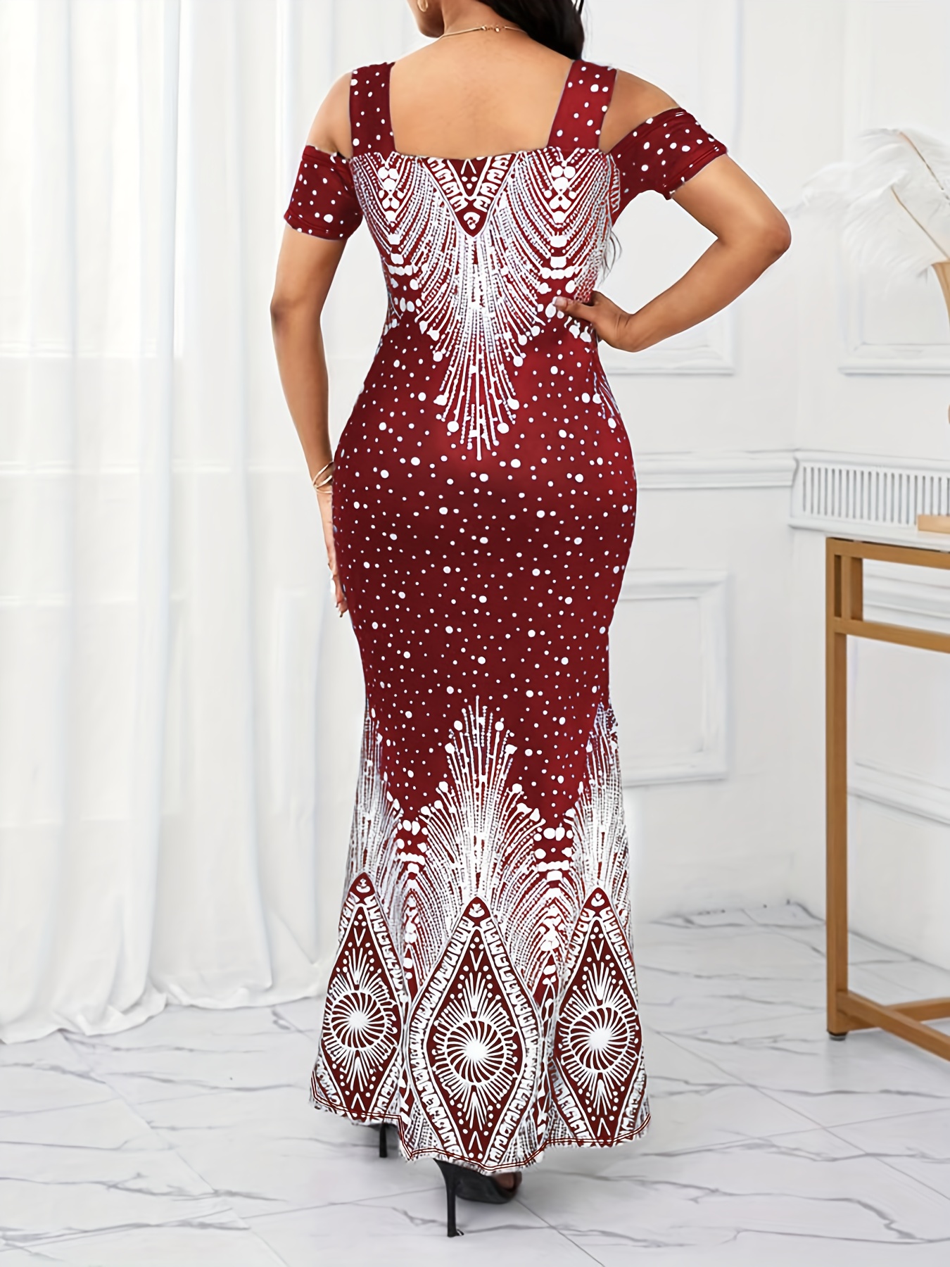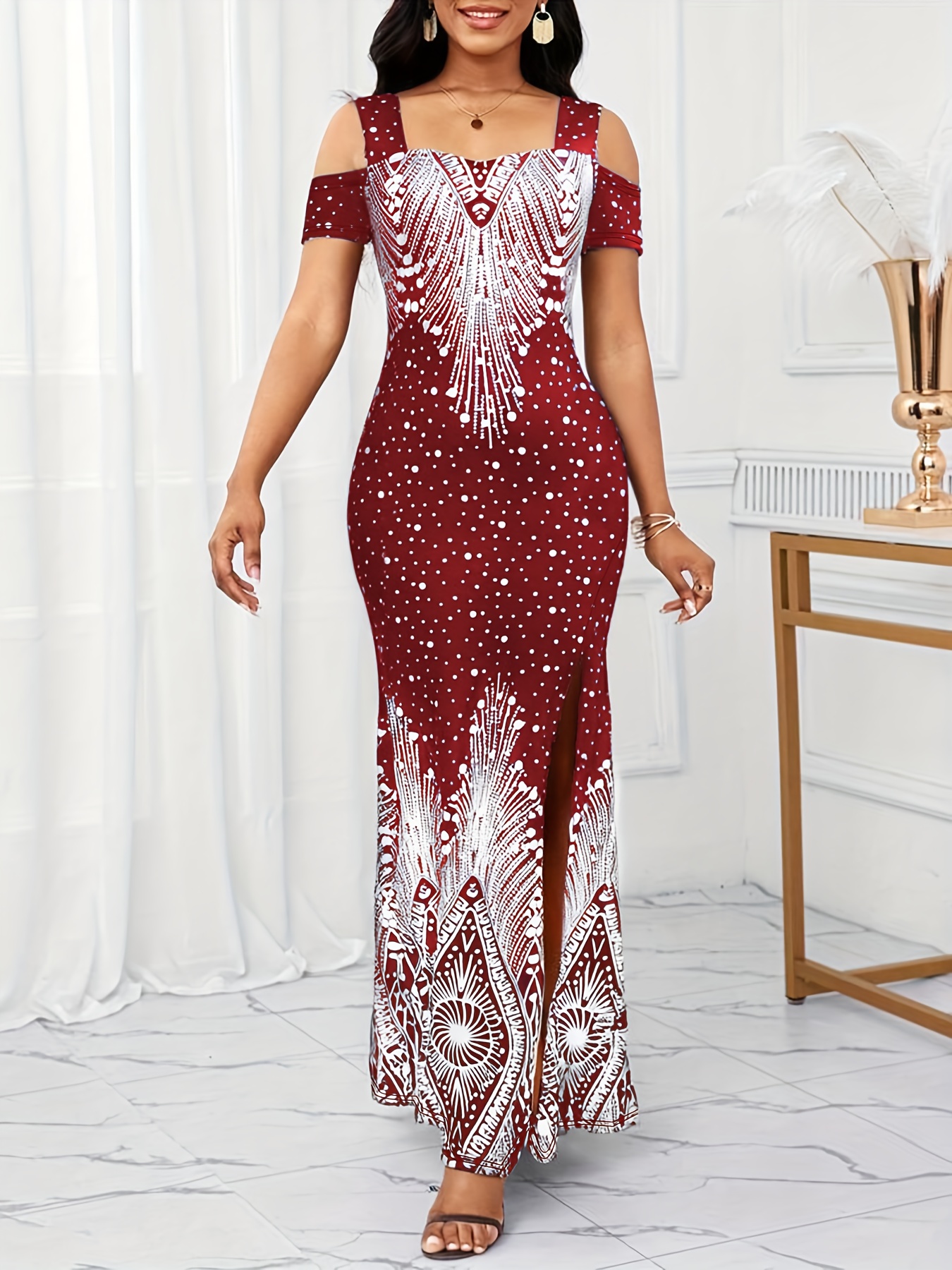 Women's Elegant Paisley Print Square Neck Off-Shoulder Evening Dress - Short Sleeve Bodycon Mermaid with Side Slit & Waist Accent, Machine Washable Summer Formal Party Wear, Evening Event Attire, Stretchy Fabric Gown, Comfort