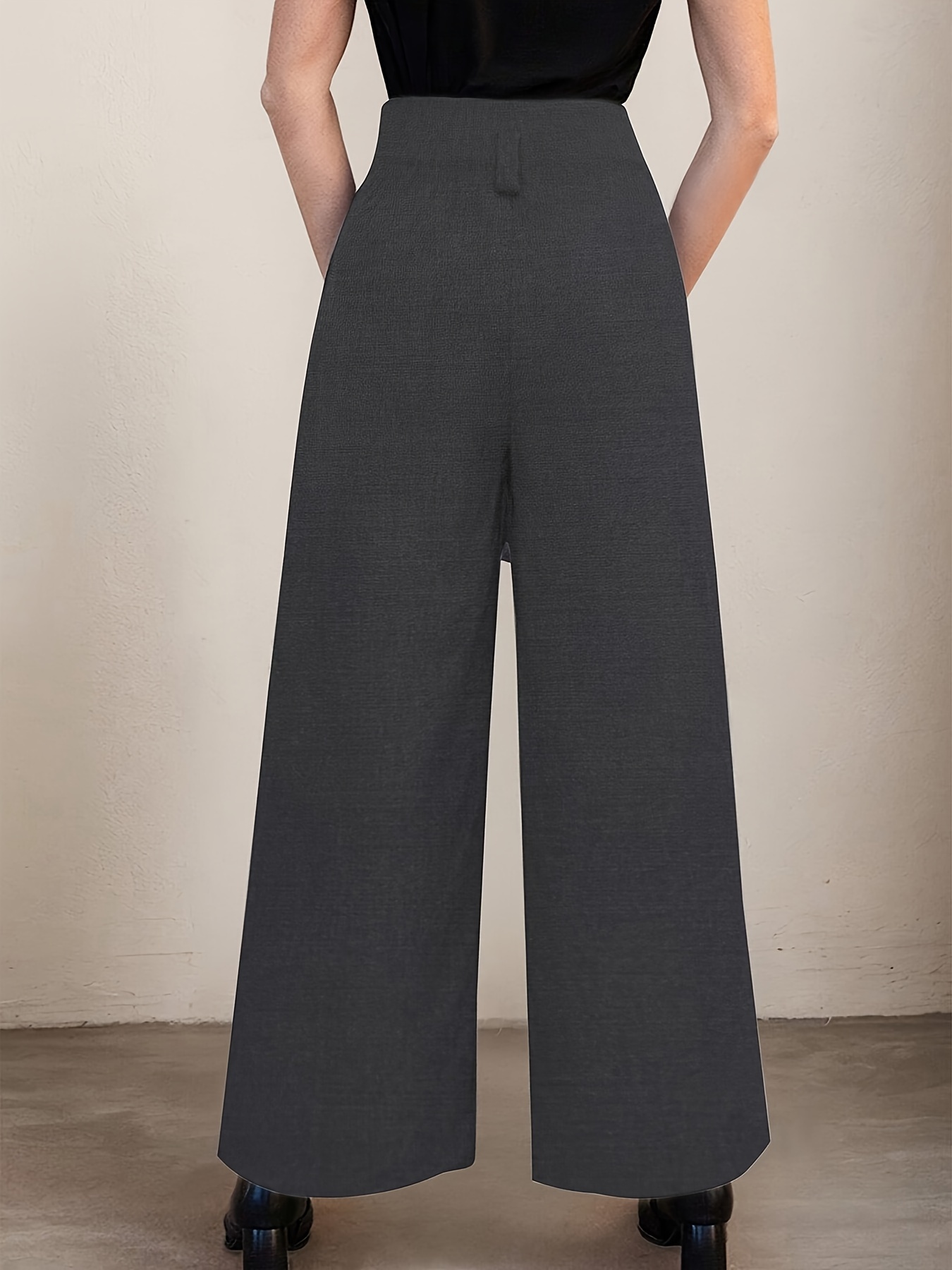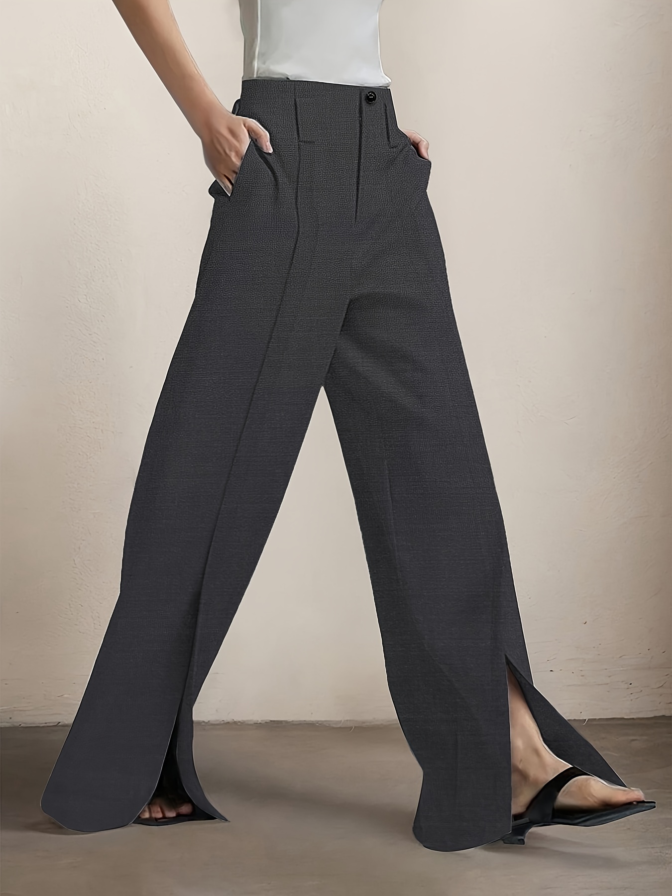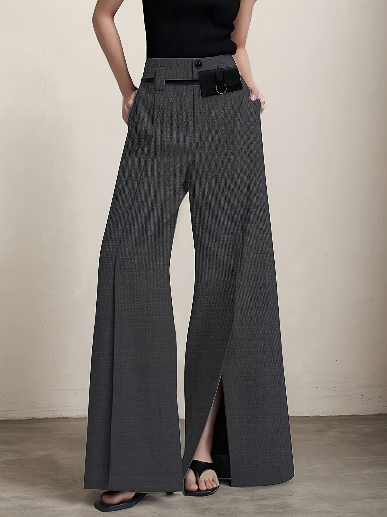 Pantalon Femme Élégant Jambe Large – Polyester, Couleur Unie, Fente Avant et Poches, Fermeture Zippée, Confortable, Automne/Hiver