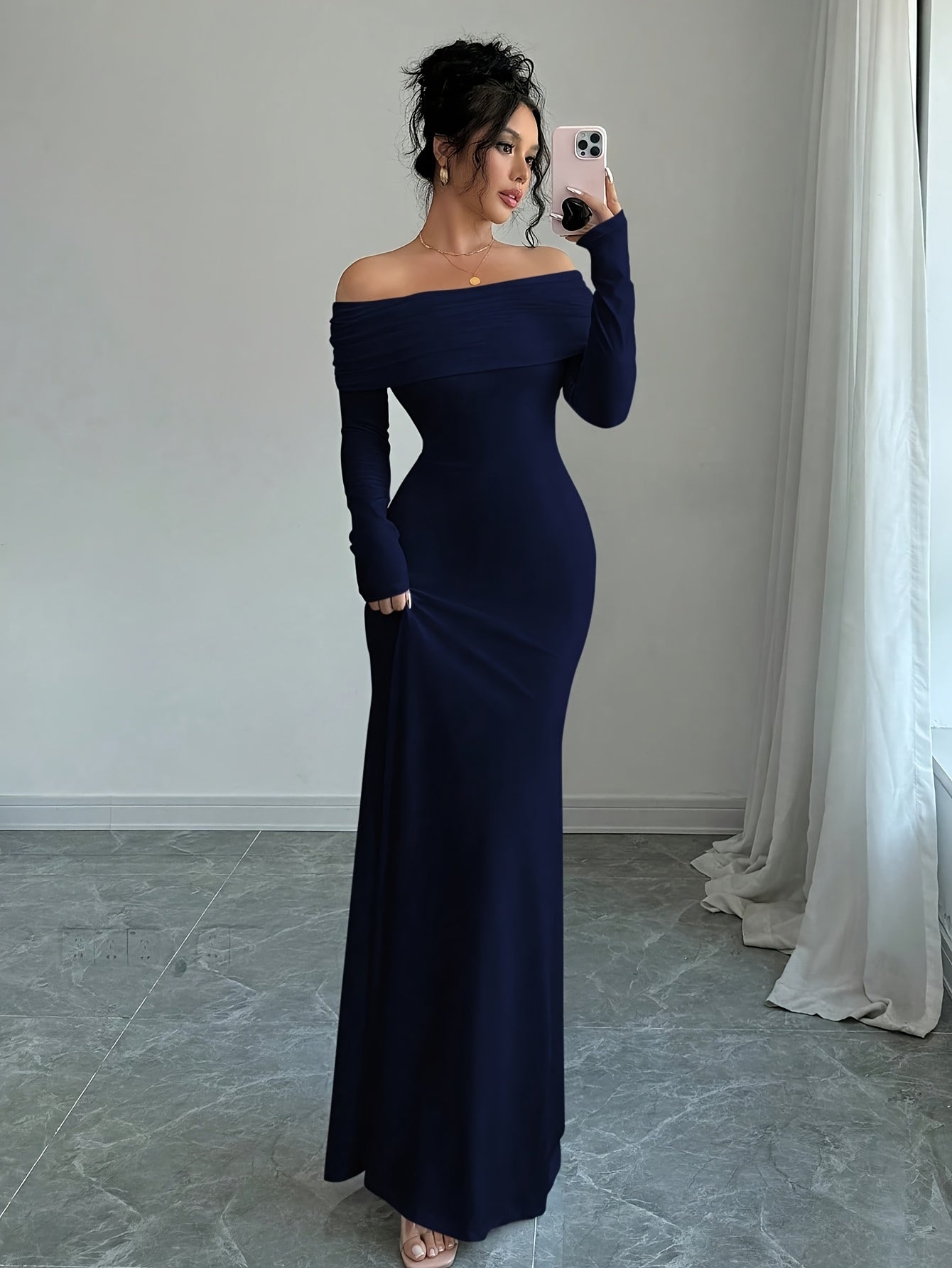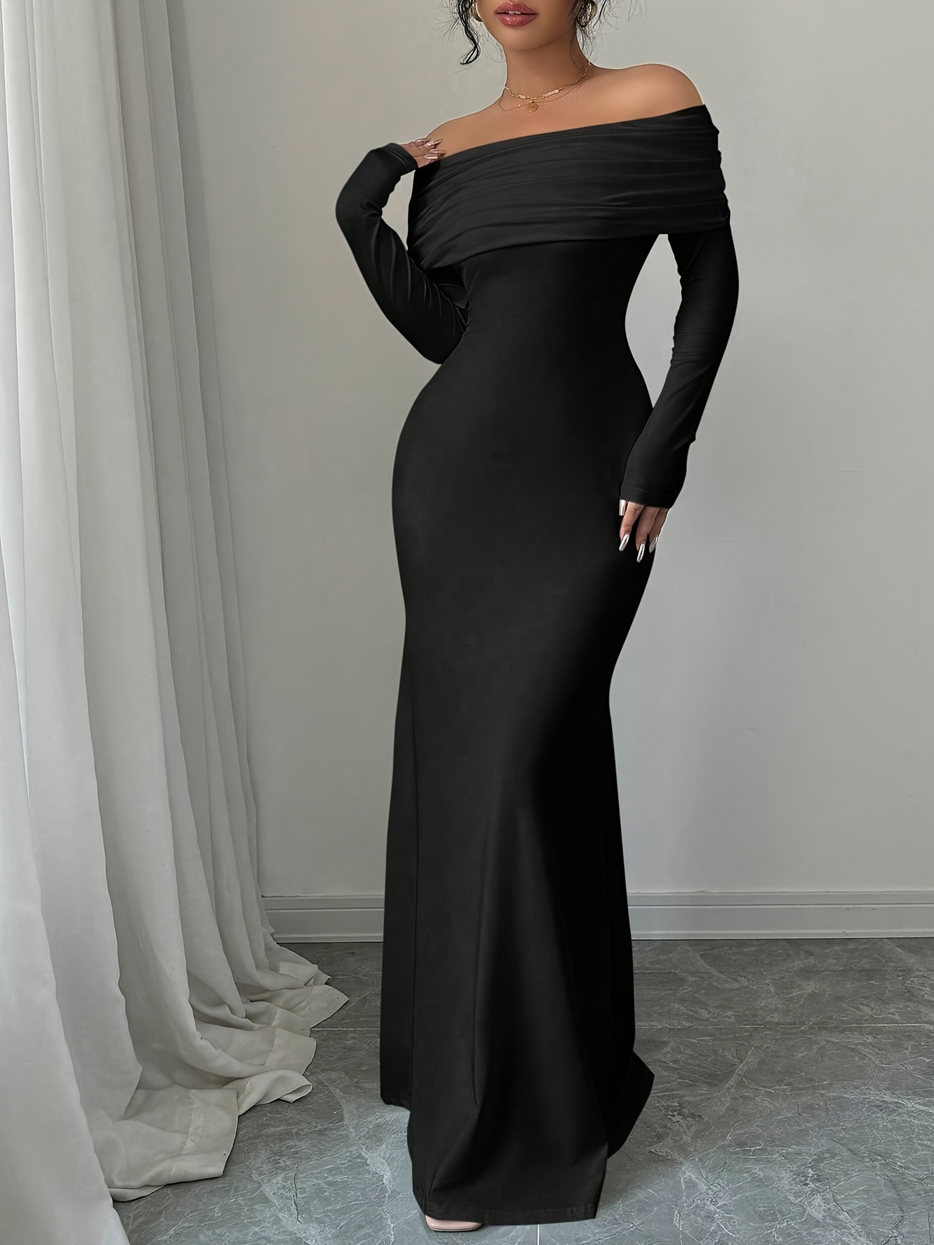 Women's Elegant Strapless/ Neck Twist Back Mermaid Dress - Solid Color Fitted Long Sleeve Dress Suitable for Weddings, Parties, Business Events - Machine Washable Year-Round Wear