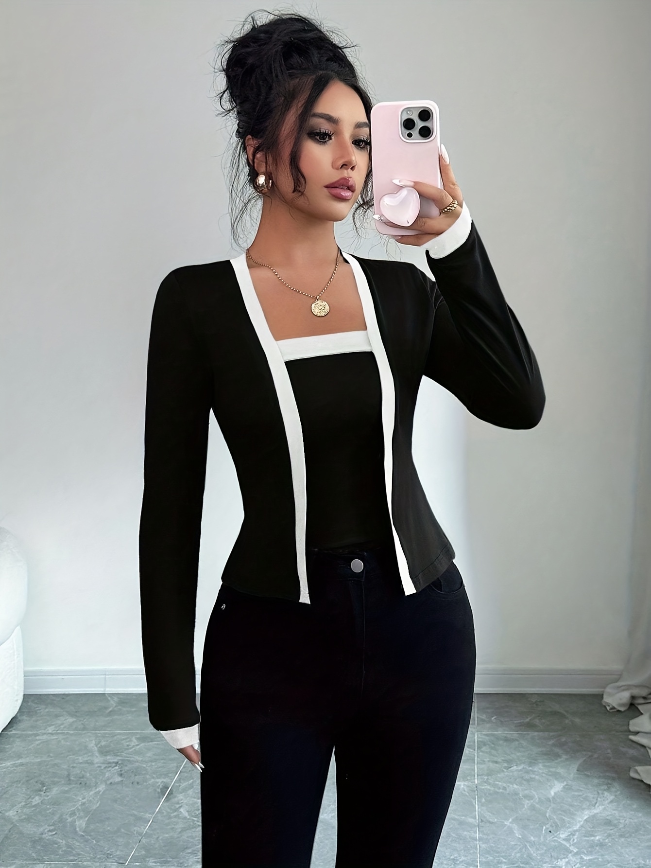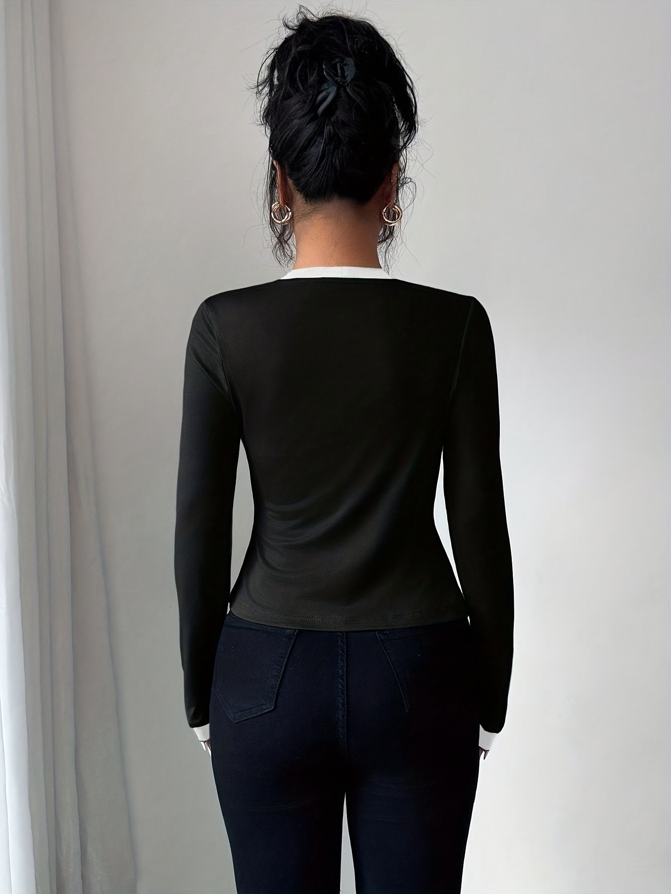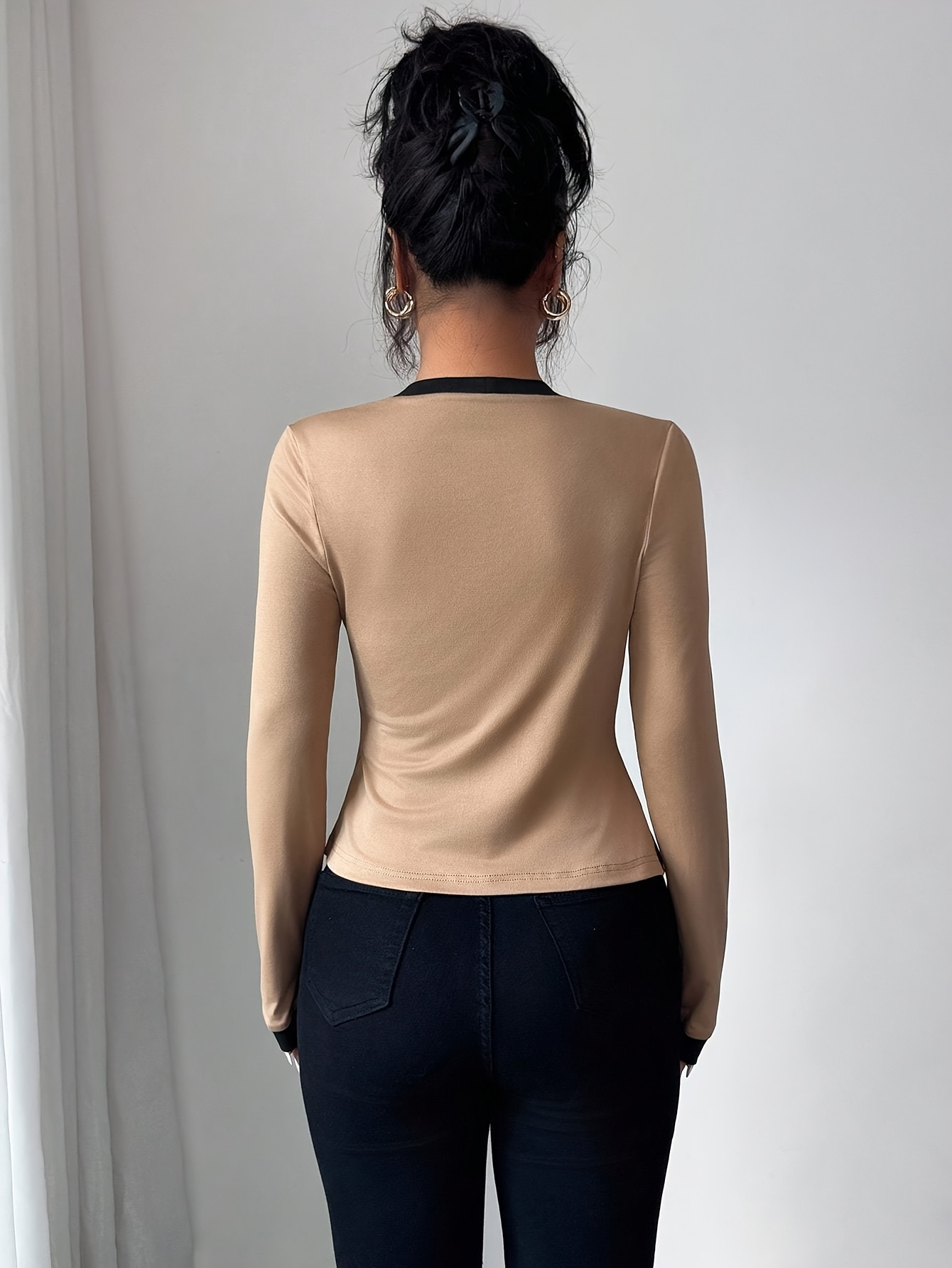 Chemisier bicolore élégant pour femmes, col carré, manches longues, style polyvalent toutes saisons, tenue décontractée ou formelle