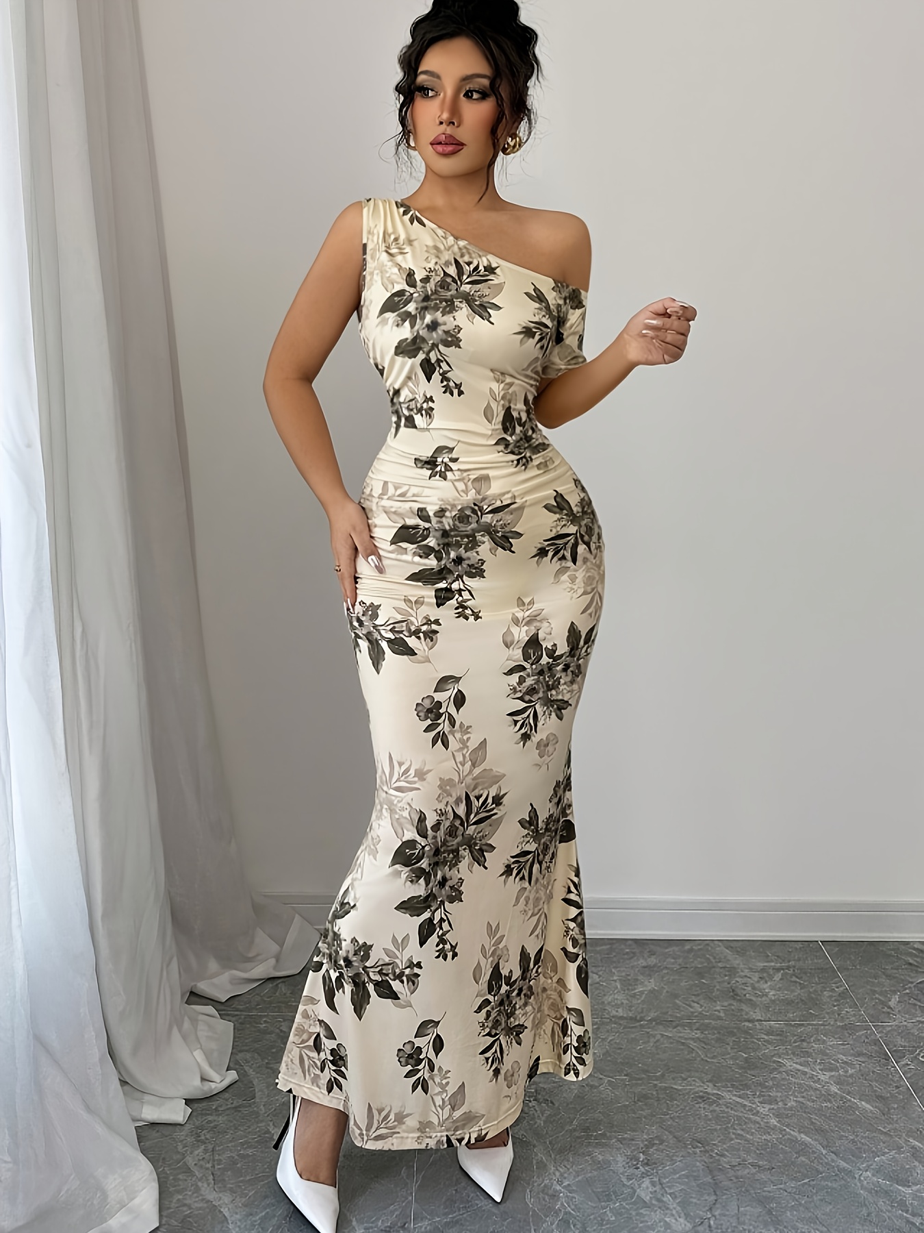 Women's Floral Print Asymmetrical Shoulder Ruffle Design Mermaid Hem Elegant and Delicate Party Date Dress