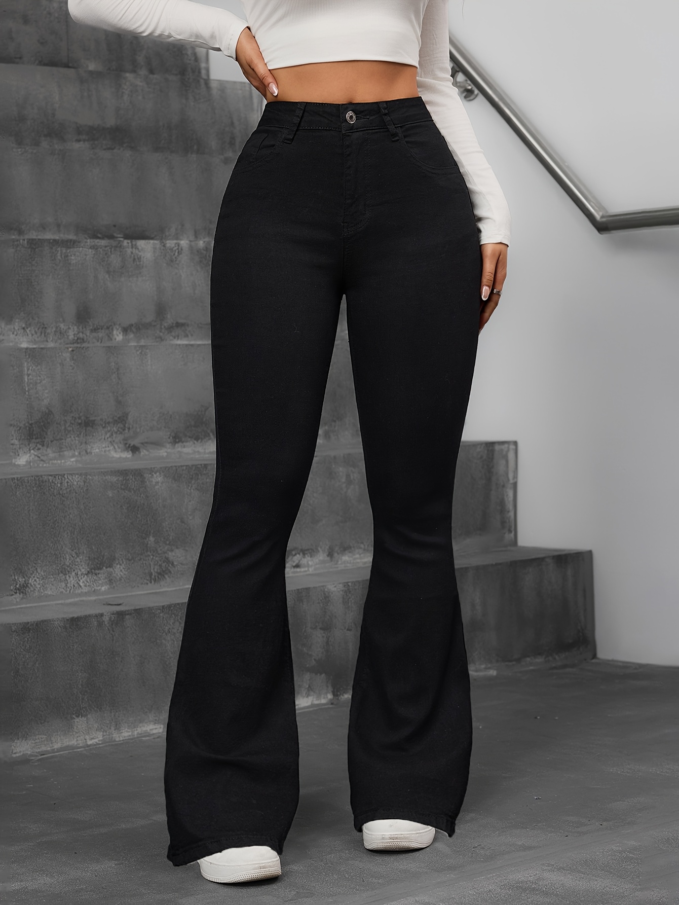Jean évasé taille haute pour femmes – Slim fit, fermeture bouton, longue, noir, style casual, toutes saisons
