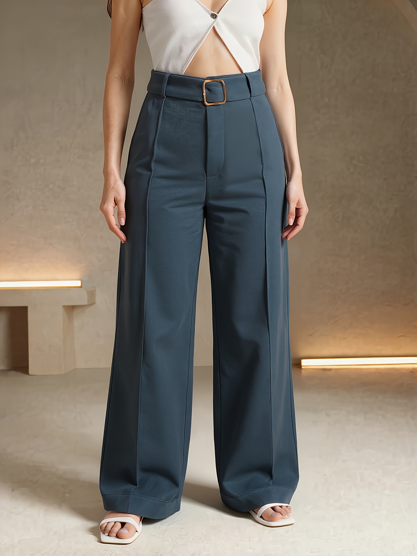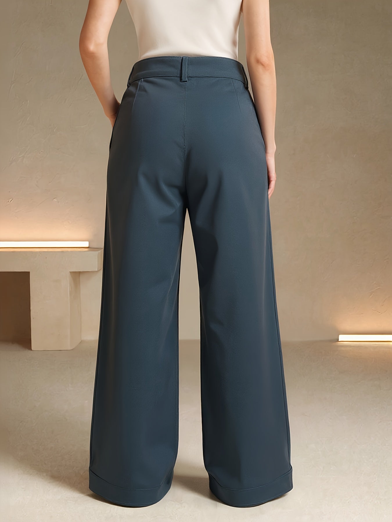 Pantalon Femme Taille Haute – Jambe Large Bleu Foncé, Ceinturé, Poches, Bureau et Décontracté, Tous Saisons