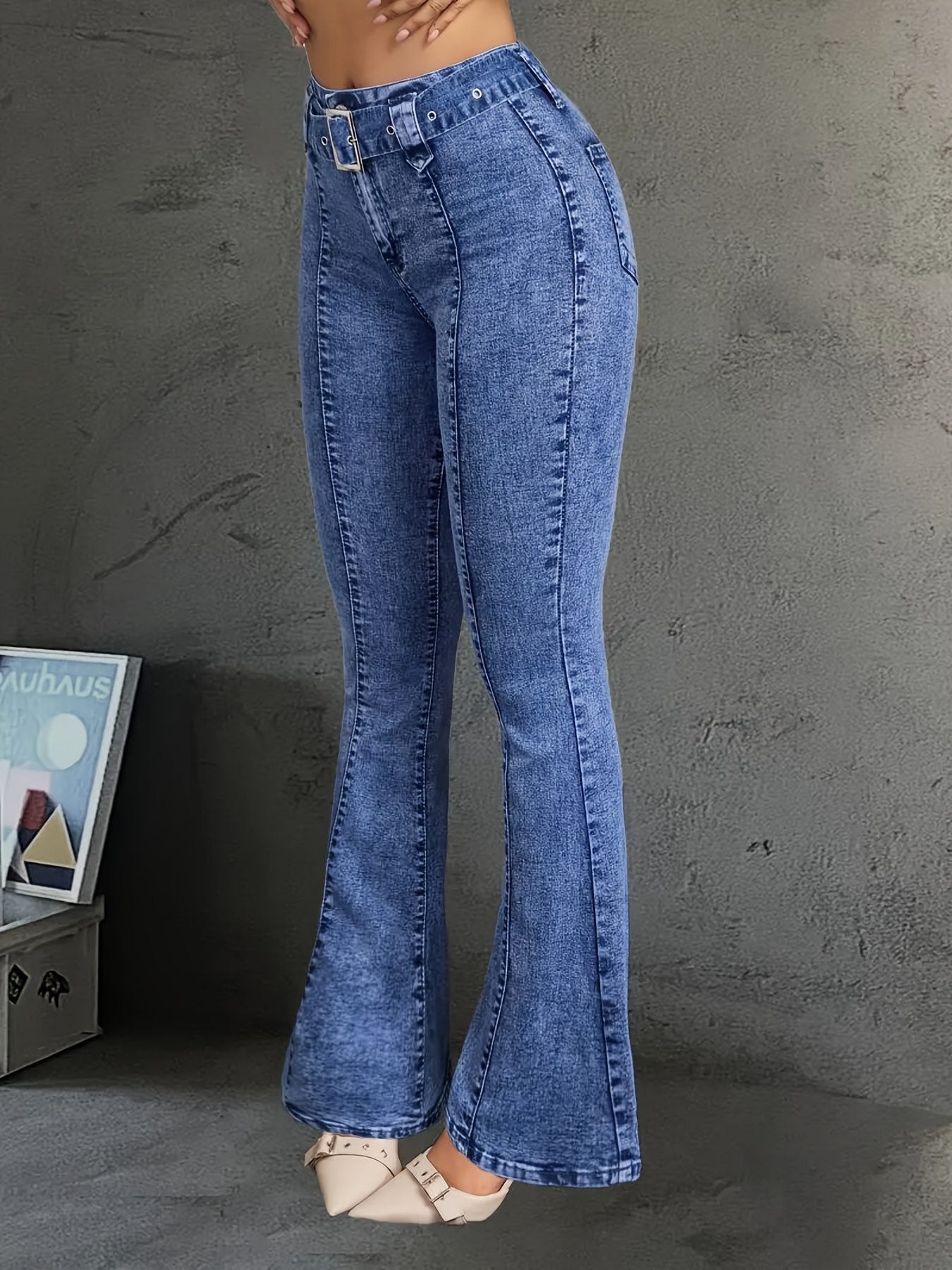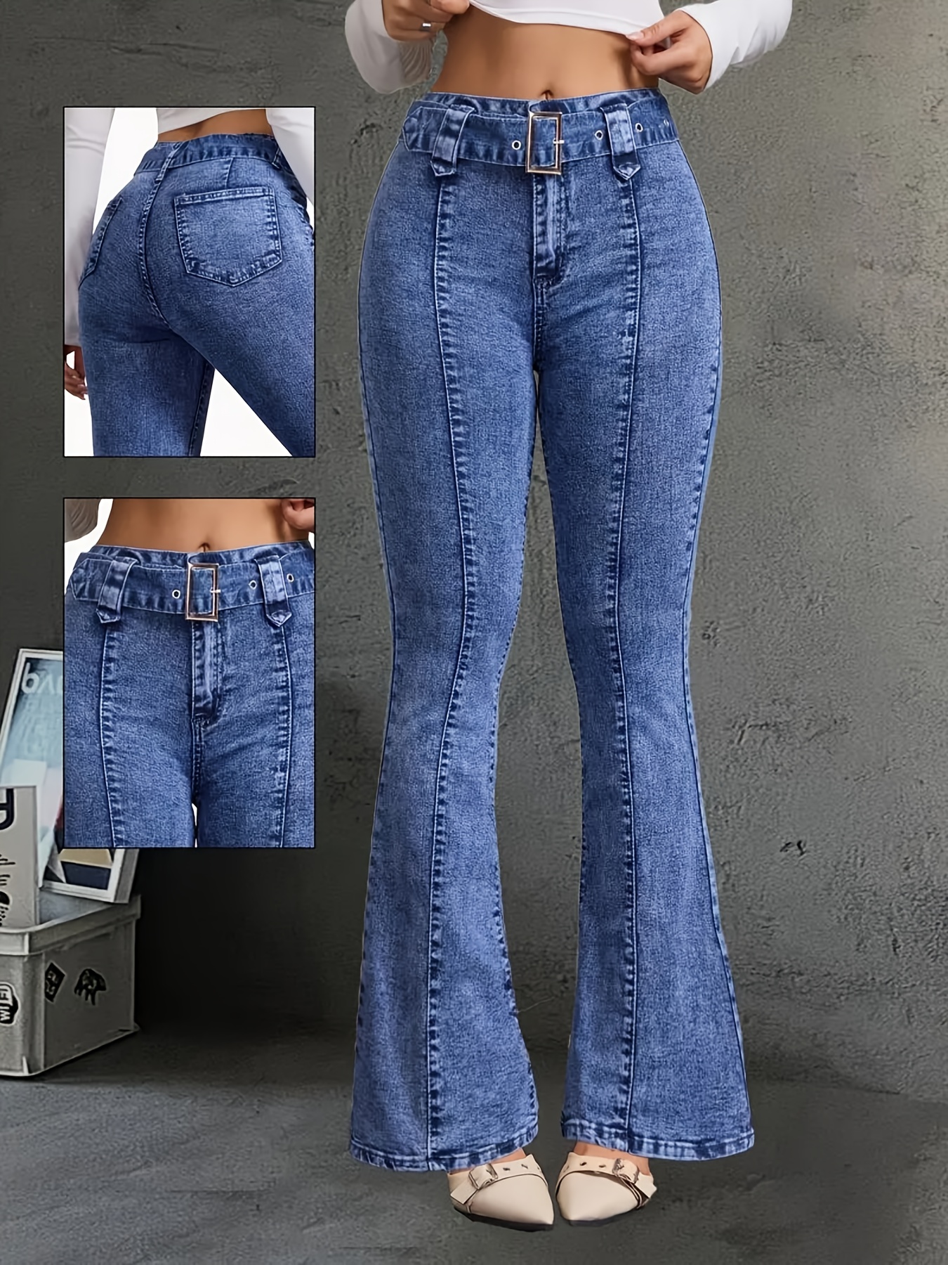 Jean Femme Taille Haute Évasé Ceinture Bleu Clair Délavé