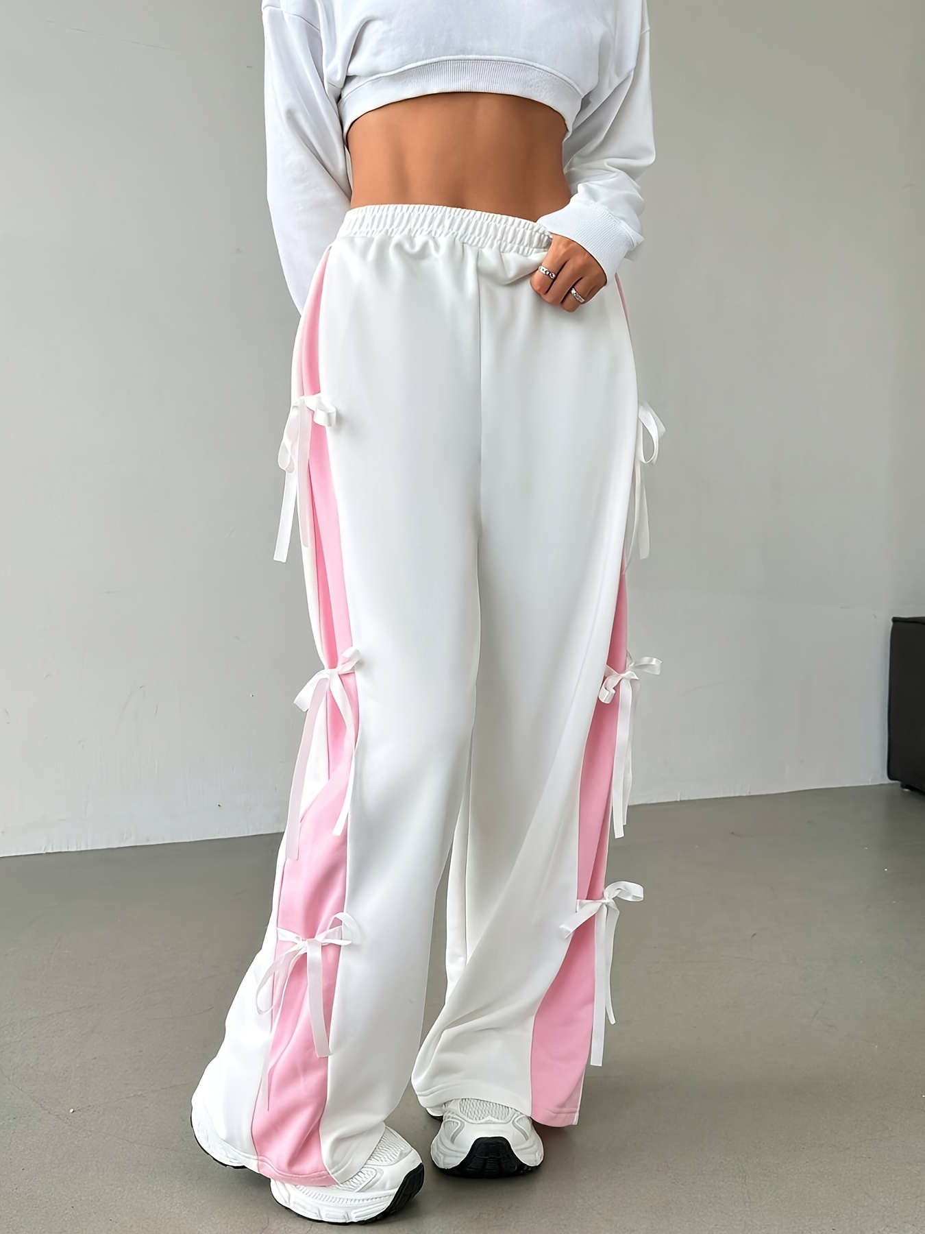 Pantalon Femme Taille Haute – Jambe Large avec Rayures Contraste Rose/Blanc, Taille Élastique à Cordon, Décontracté, Printemps/Été/Automne