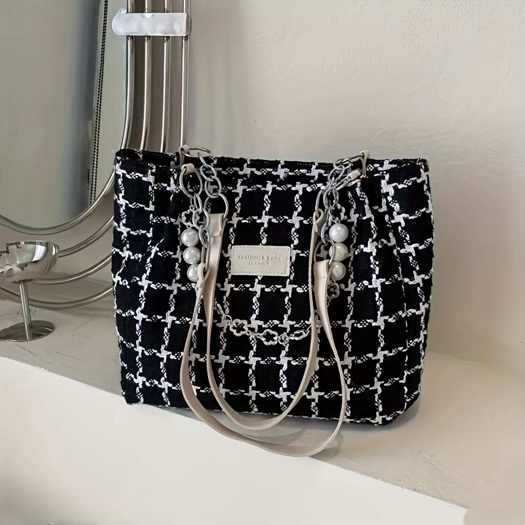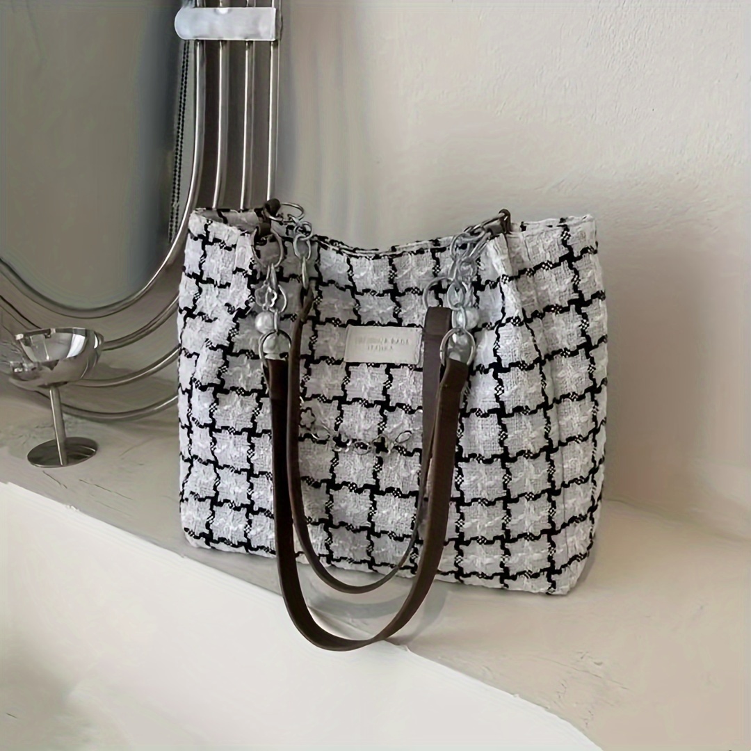 Sac cabas femme – grande capacité, motif pied-de-poule noir et blanc, poignée poignet, chaîne décorative, fermeture éclair, hardware doré, pratique pour voyage et usage quotidien