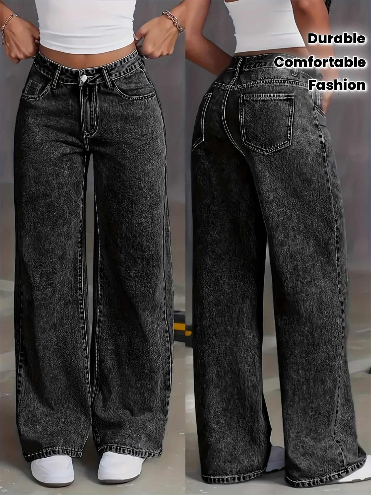 Jeans Femme Grande Taille Taille Haute Jambe Droite Extensible Effet Snow-Wash Confort Toute Saison Style Bohème Durable