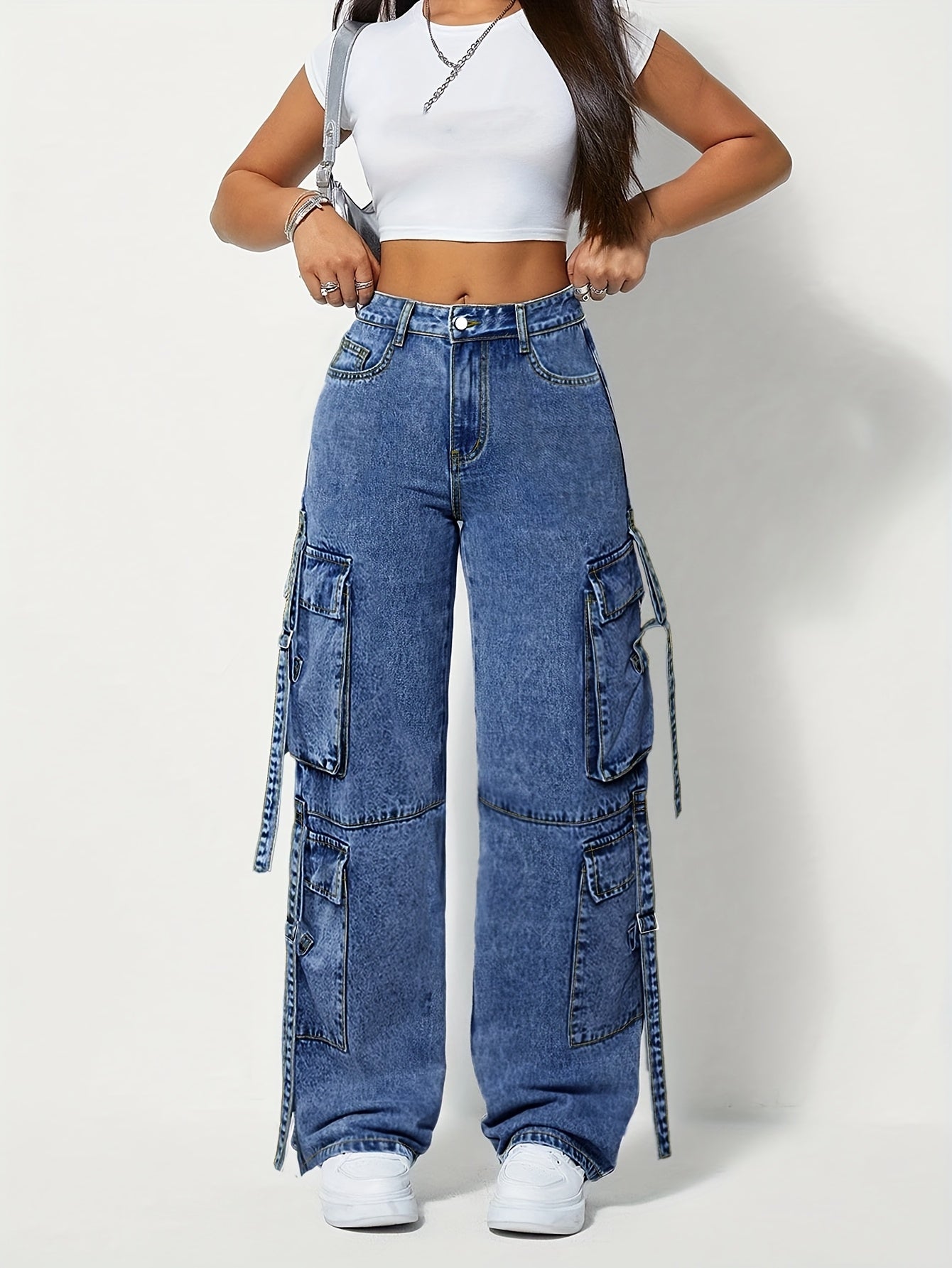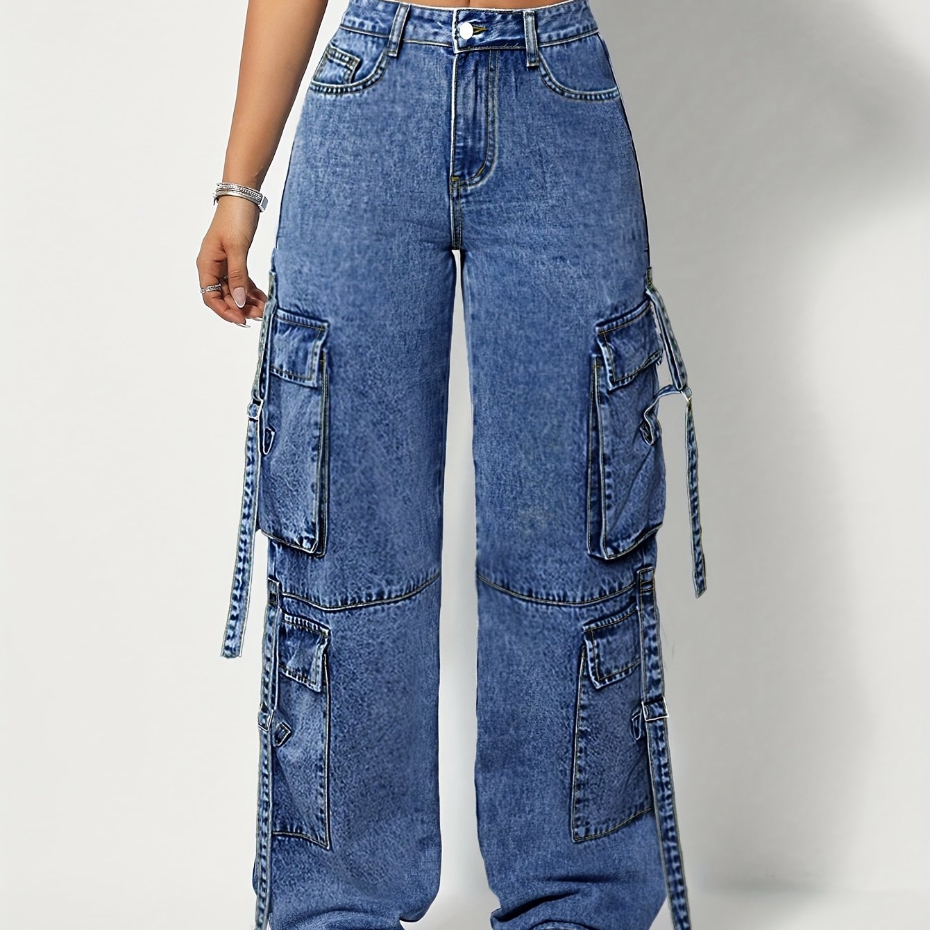 Jeans de travail extensibles taille haute pour femme grande taille – Pantalon cargo large, passants pour ceinture, poches multiples, fermeture à boutons, bleu résistant