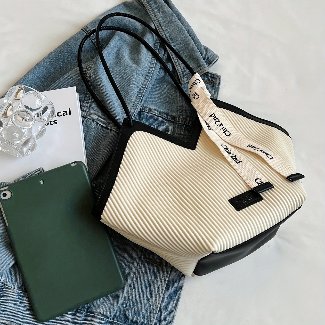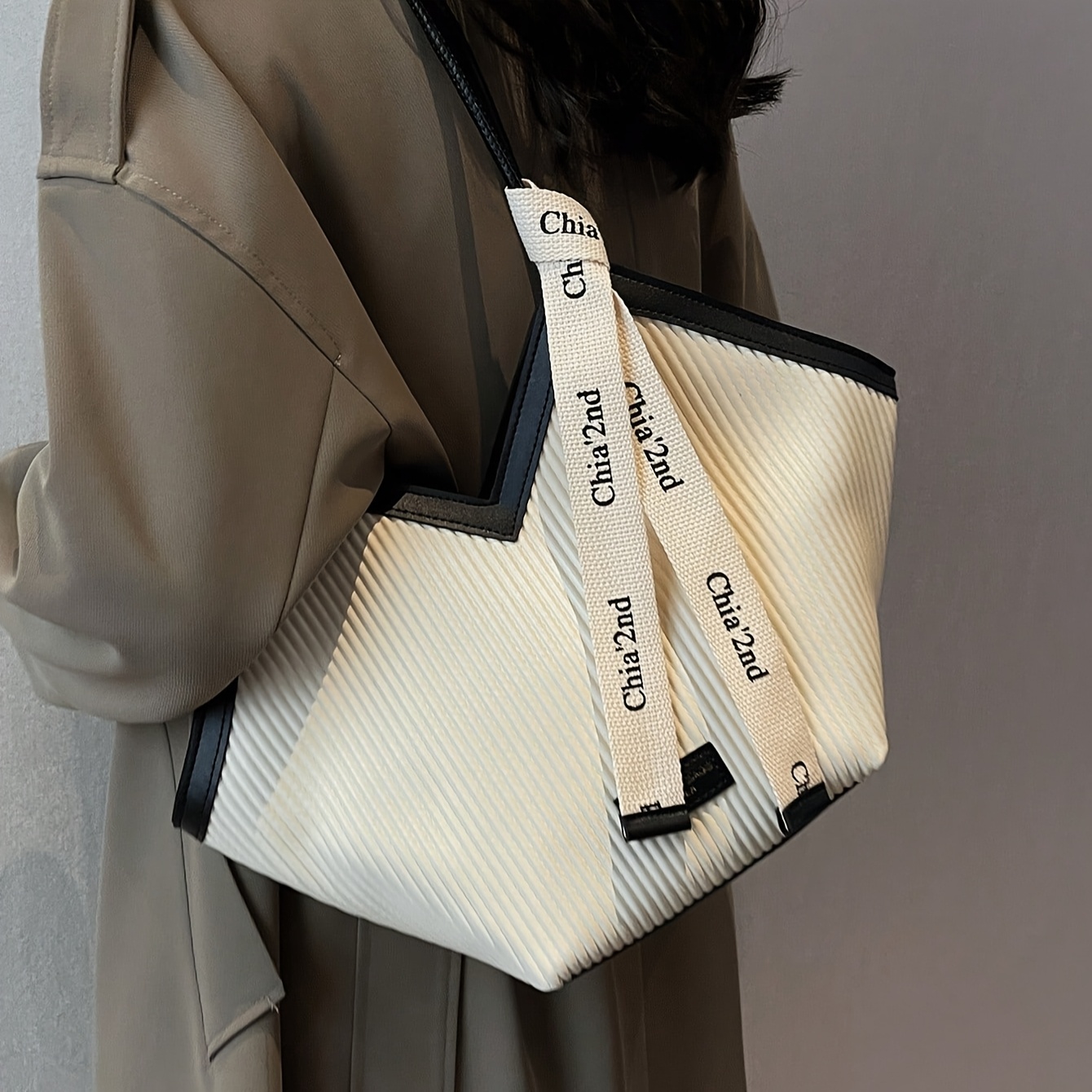 Sac cabas femme élégant blanc à détails noirs – design structuré à rayures embossées, anses doubles, foulard décoratif et fermeture zippée, idéal pour le travail, le shopping ou les voyages.