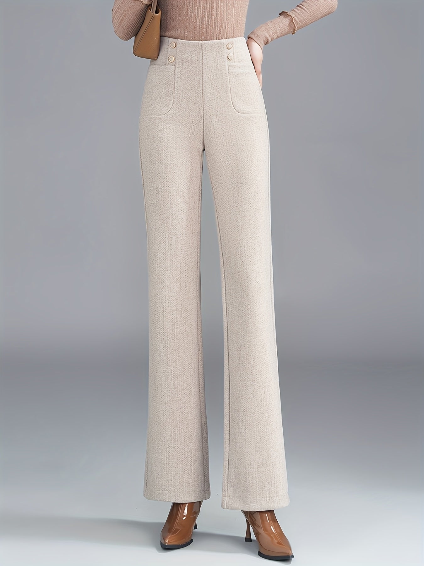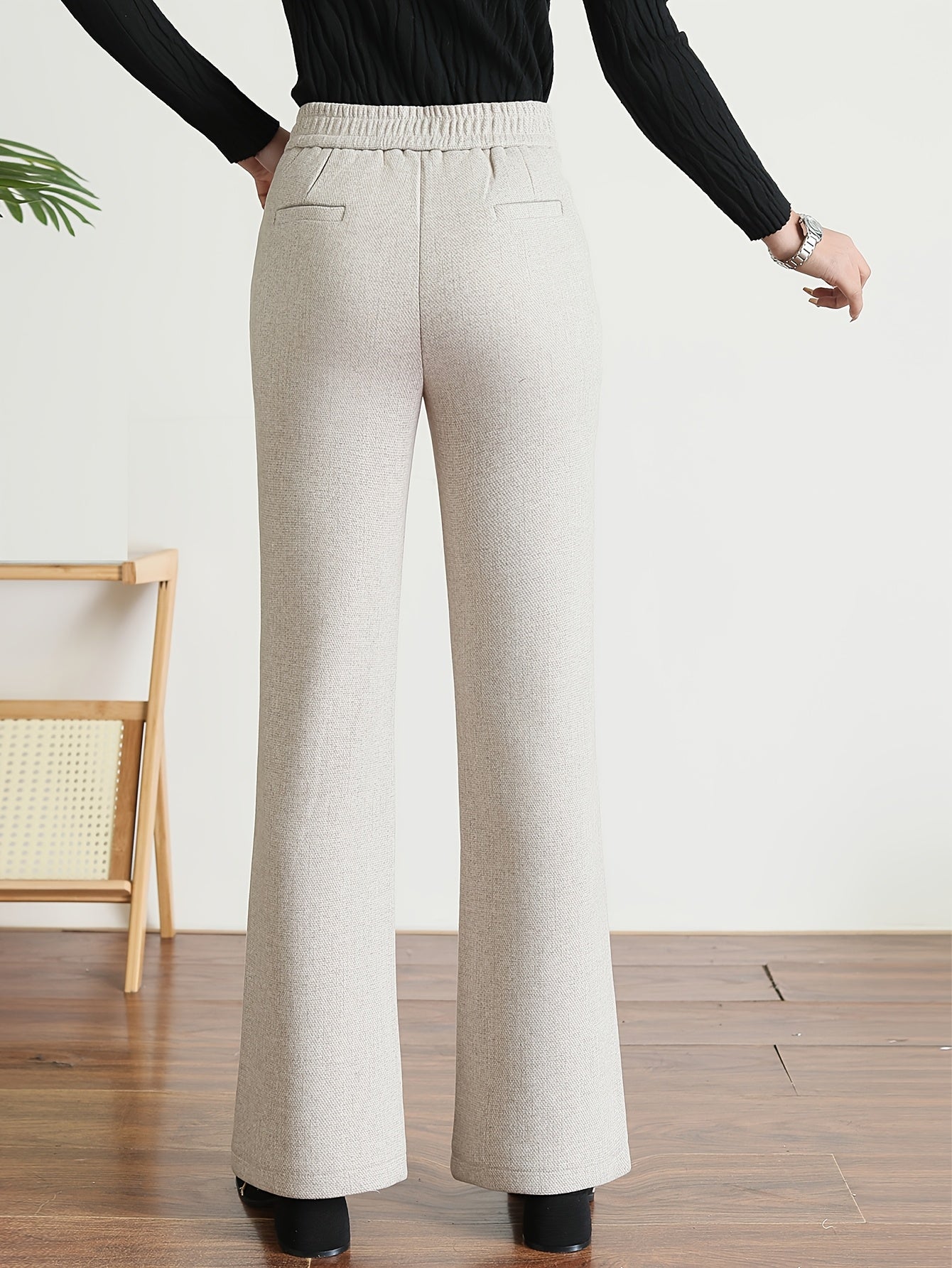 Pantalon Femme en Tweed Laine-Mélange – Jambe Droite, Taille Élastique avec Boutons, Marron Foncé, Automne/Hiver, Élégant et Décontracté