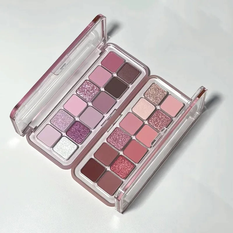 Palette fards à paupières 12 couleurs, mats et scintillants, nude, rose et paillettes, pigments, longue tenue, waterproof, maquillage yeux