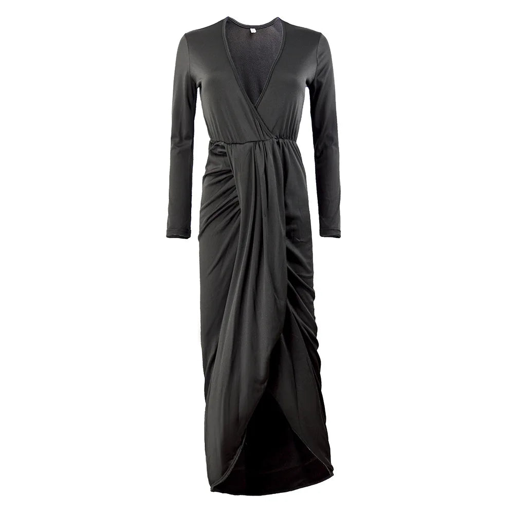 Robe Longue Femme Ajustée – Col V, Manches Longues