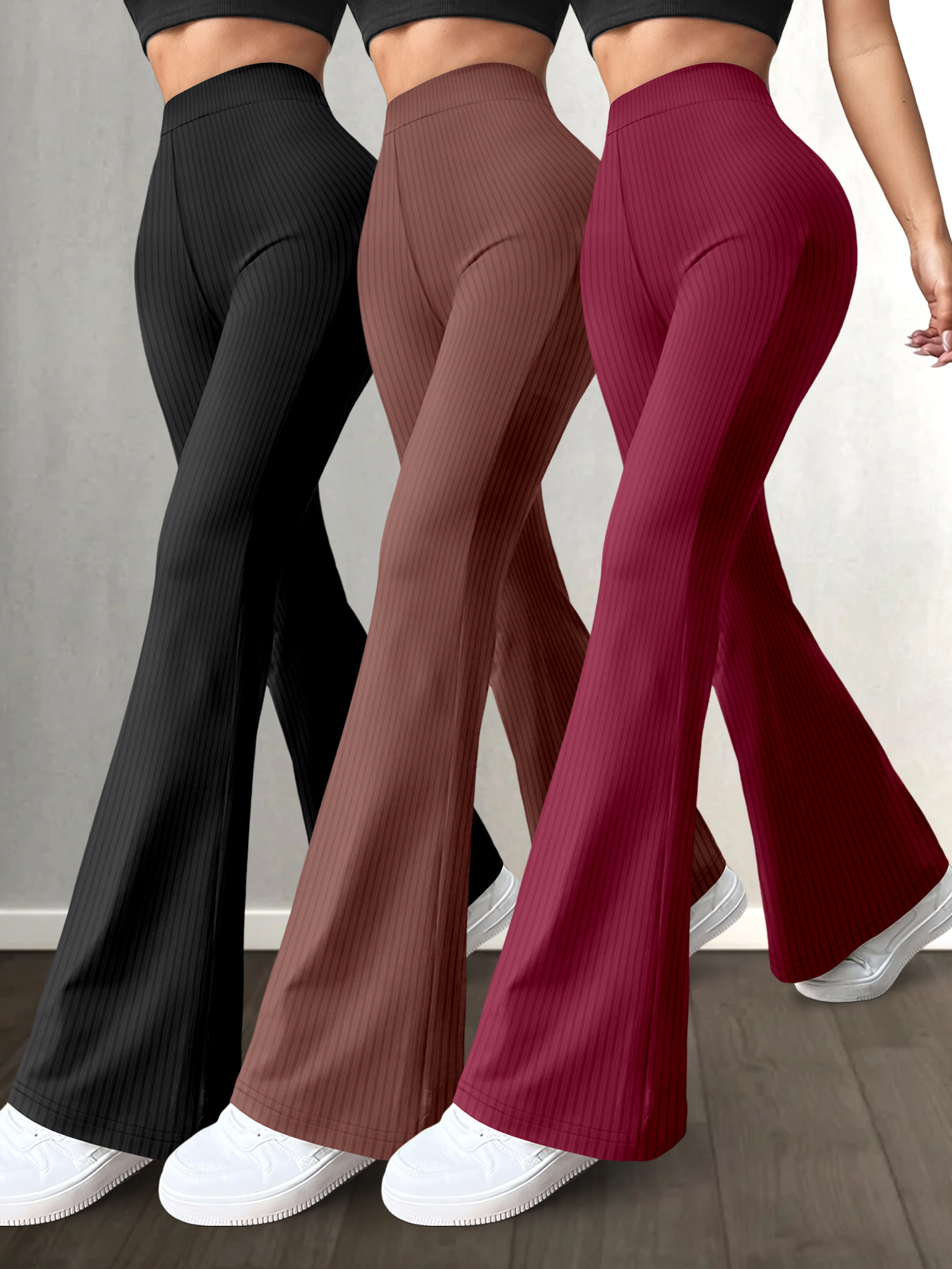 Lot de 3 Pantalons Femme Taille Haute – Jambe Évasée, Couleur Unie, Extensibles et Confortables