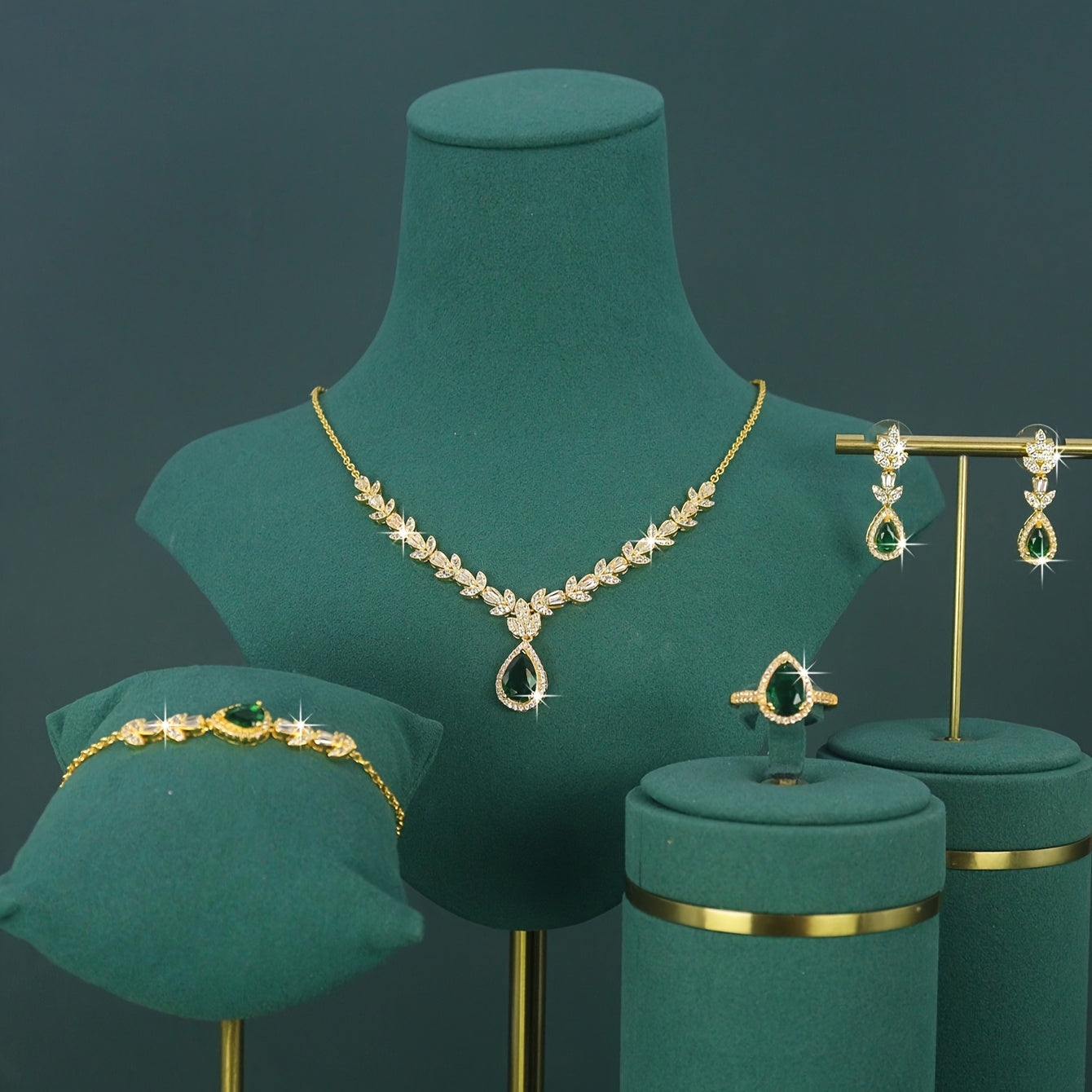 Ensemble mariage luxe 5 pièces – plaqué 18K, style royal moyen-oriental, design goutte, zirconia oxydé 3D vert, rouge et blanc incrusté à la main, comprenant collier, bracelet, boucles d’oreilles et bague, adapté au port quotidien