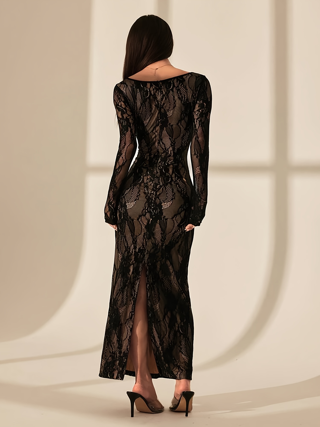 Robe noire d’automne pour femme, col en V, détails en dentelle contrastante, idéale pour soirées et fêtes