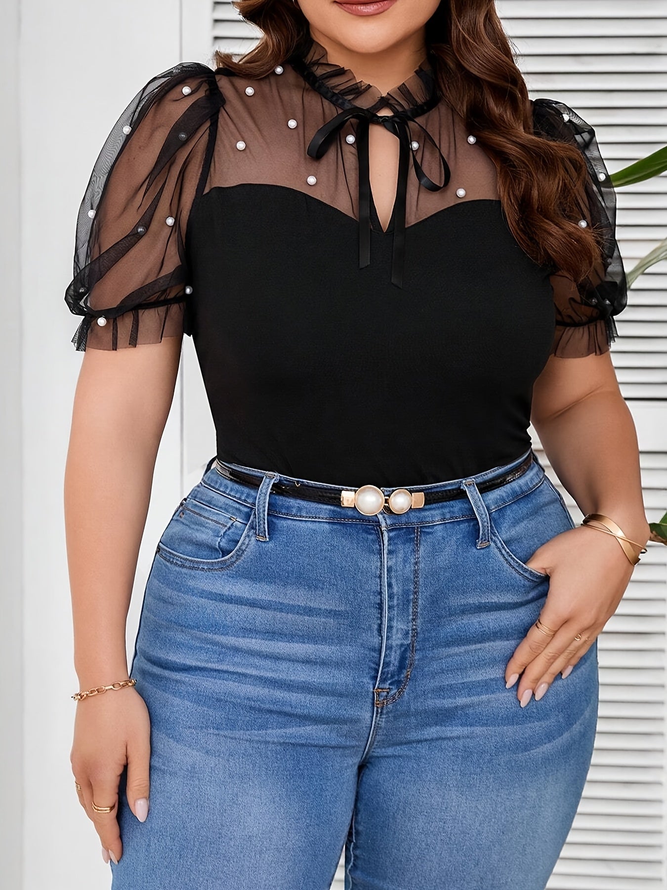 T-shirt estival élégant pour femmes grande taille, manches courtes avec empiècements en mesh et col contrasté à nouer
