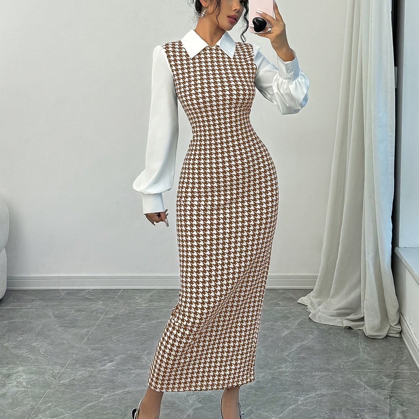 Ladies' Elegant Houndstooth Slim-Fit Lantern Sleeve Dress
