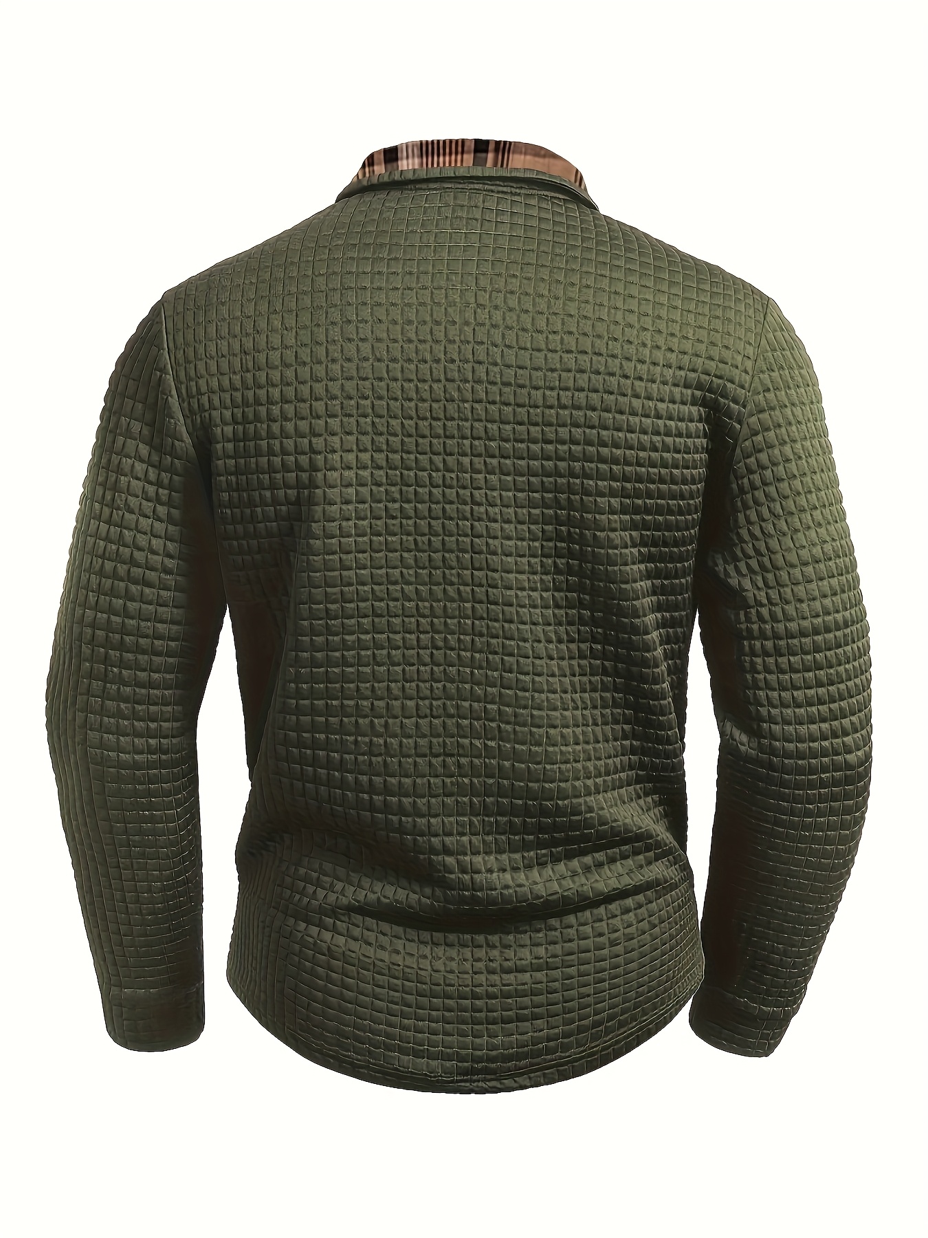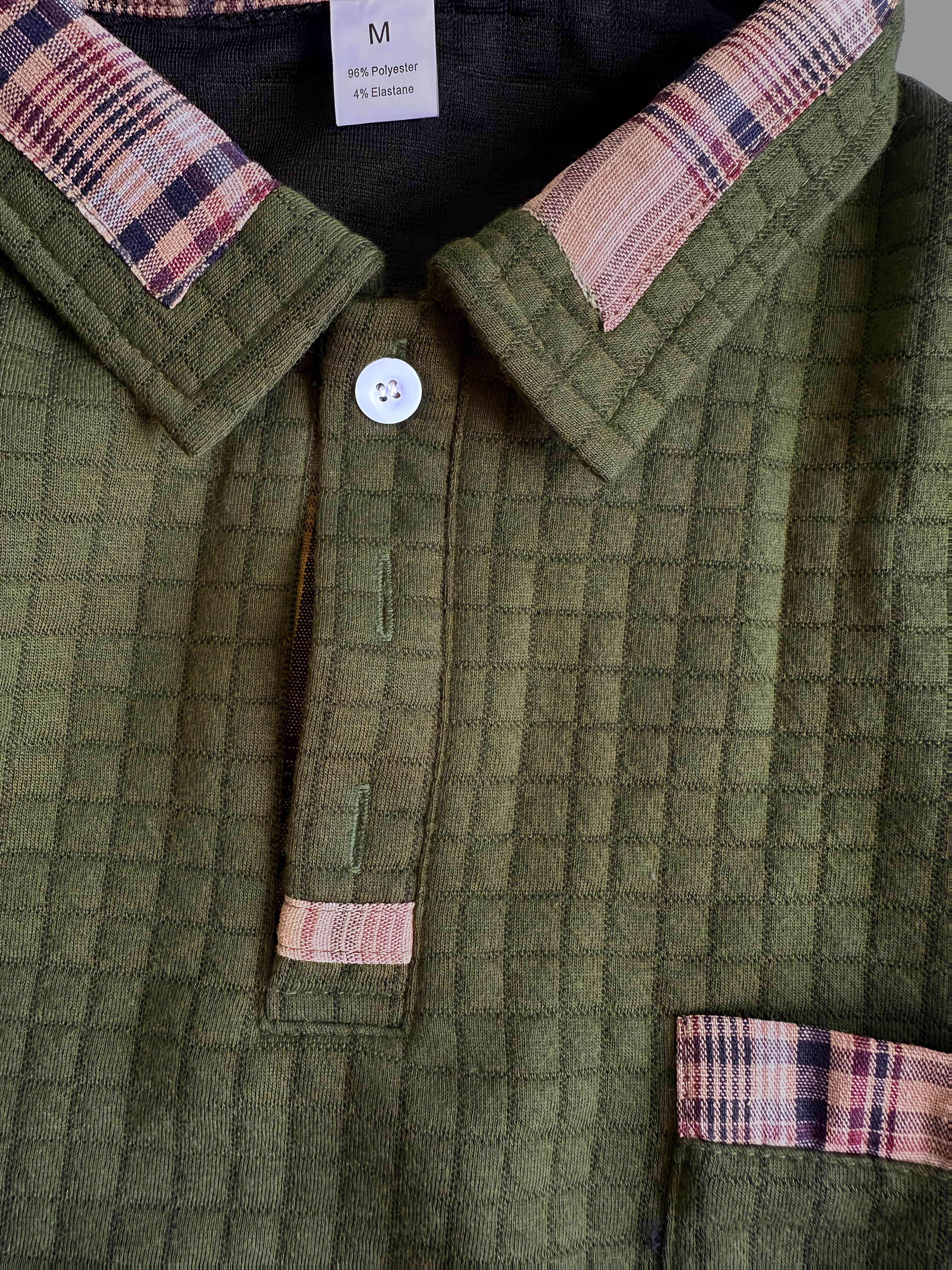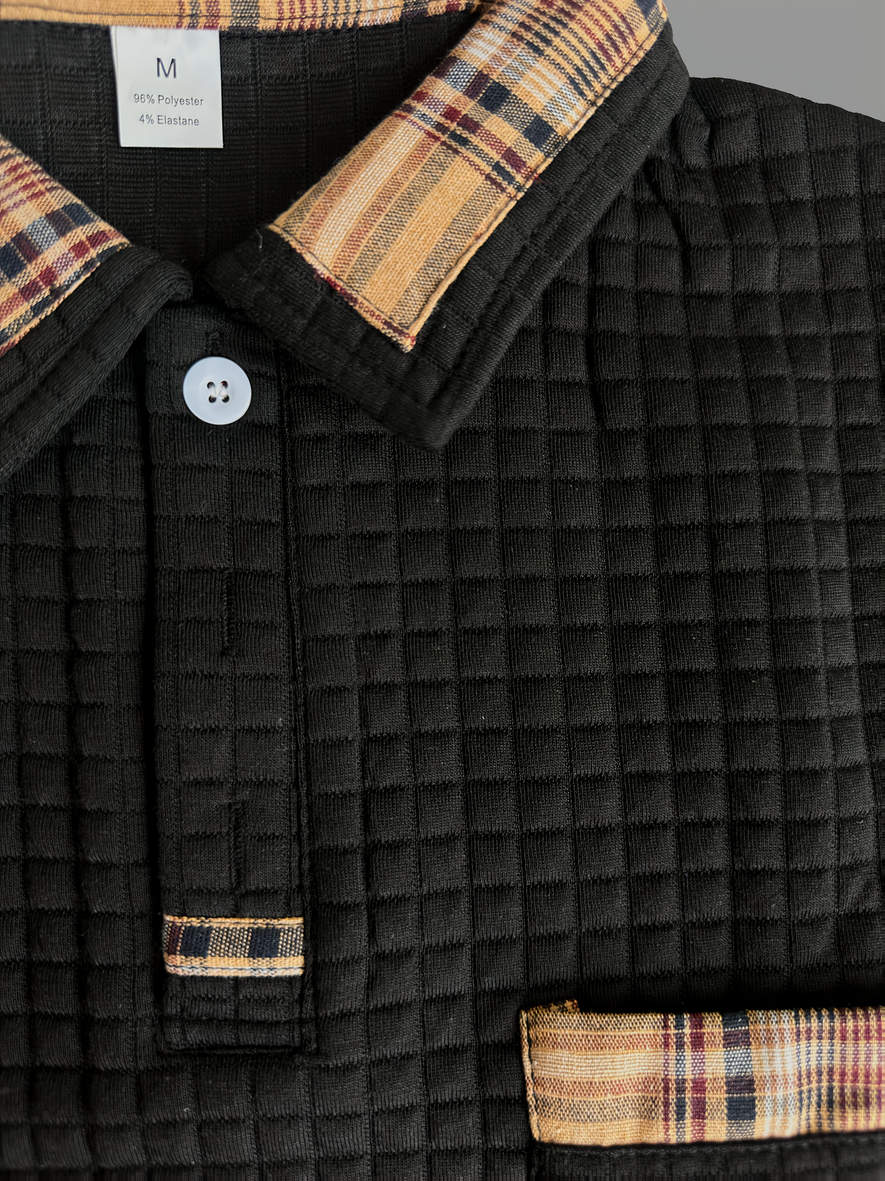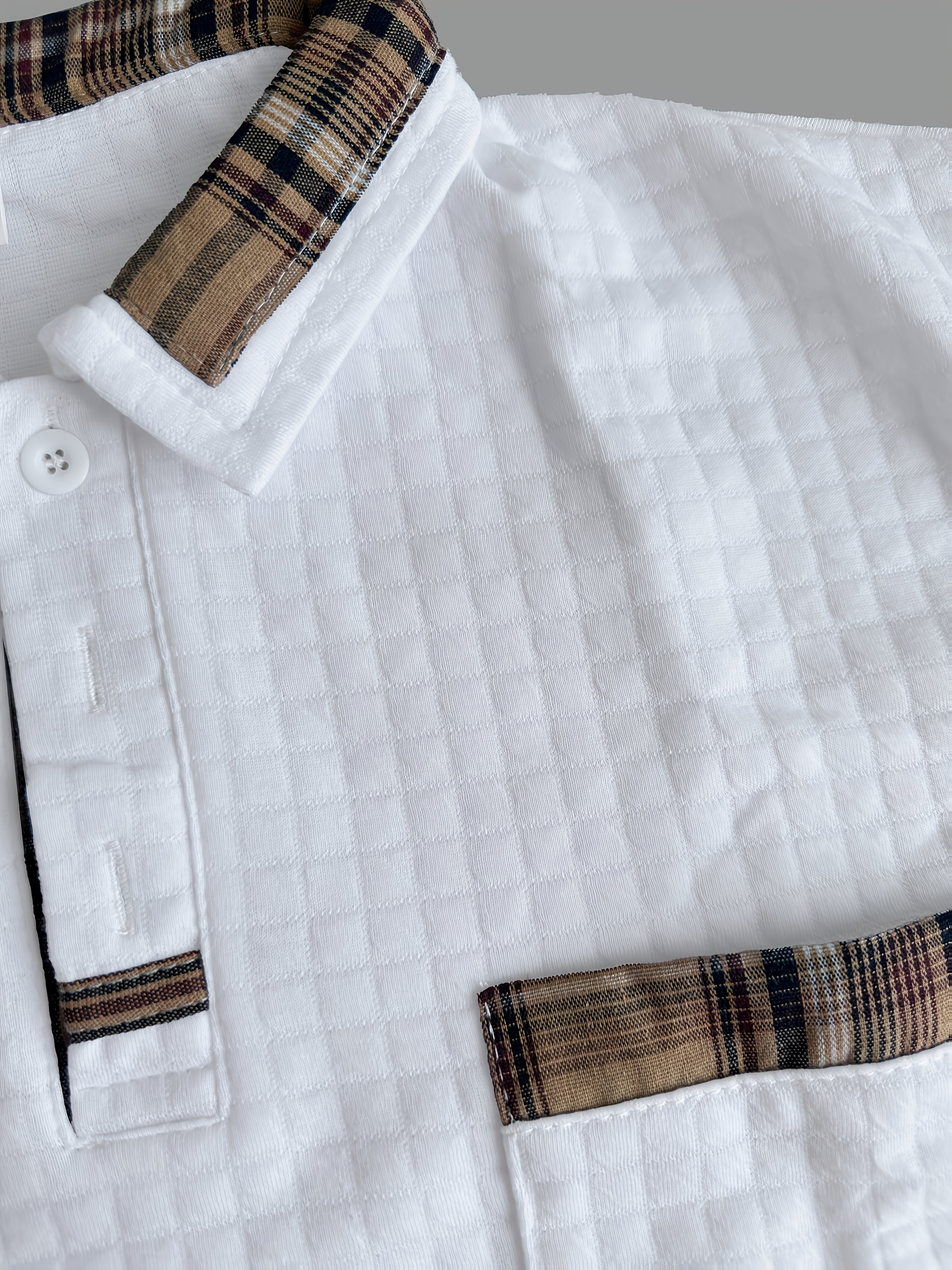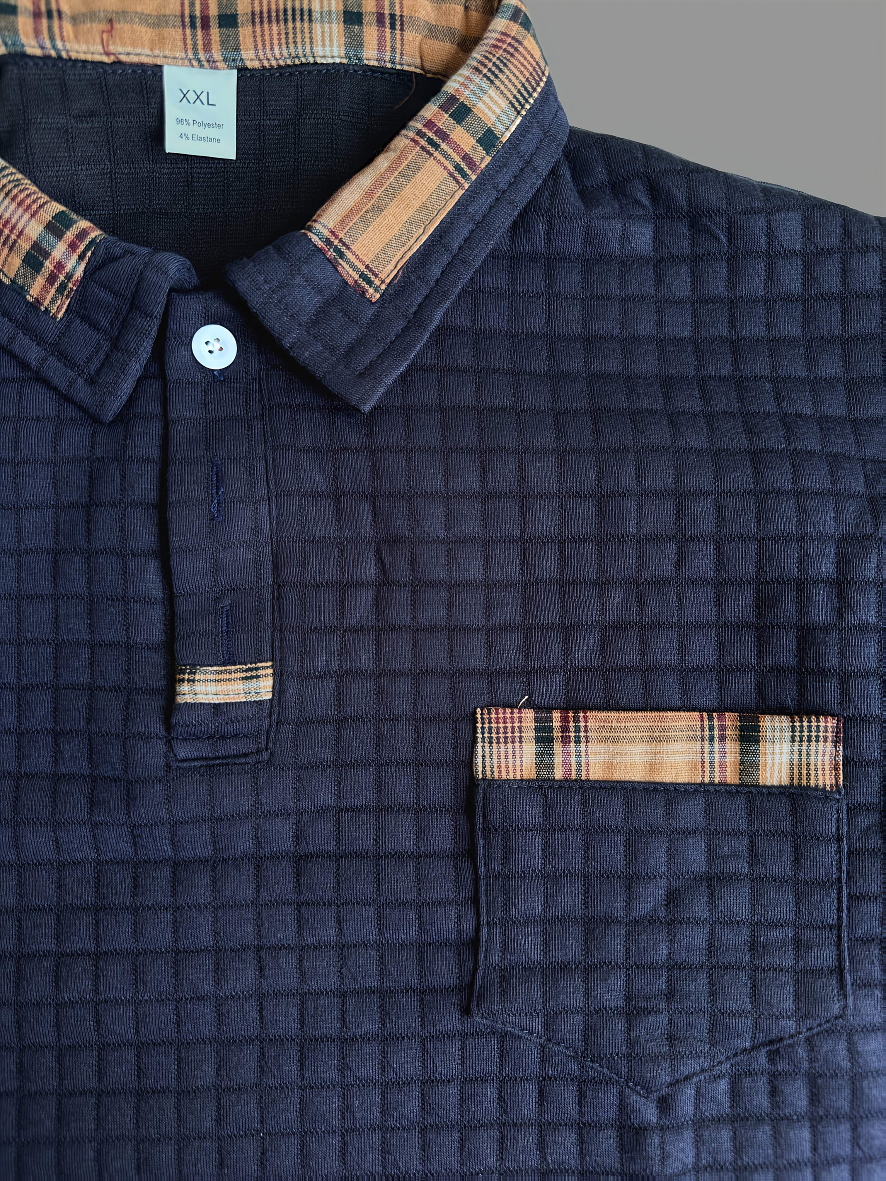 Men'S Casual Warm Long Sleeve Polo Shirt - Gray with Brown & White Plaid Collar, Button-Up Front, Textured Waffle Weave, Perfect for Fall, Casual Wear|Plaid Pattern Shirt|Buttonup Collar Shirt
