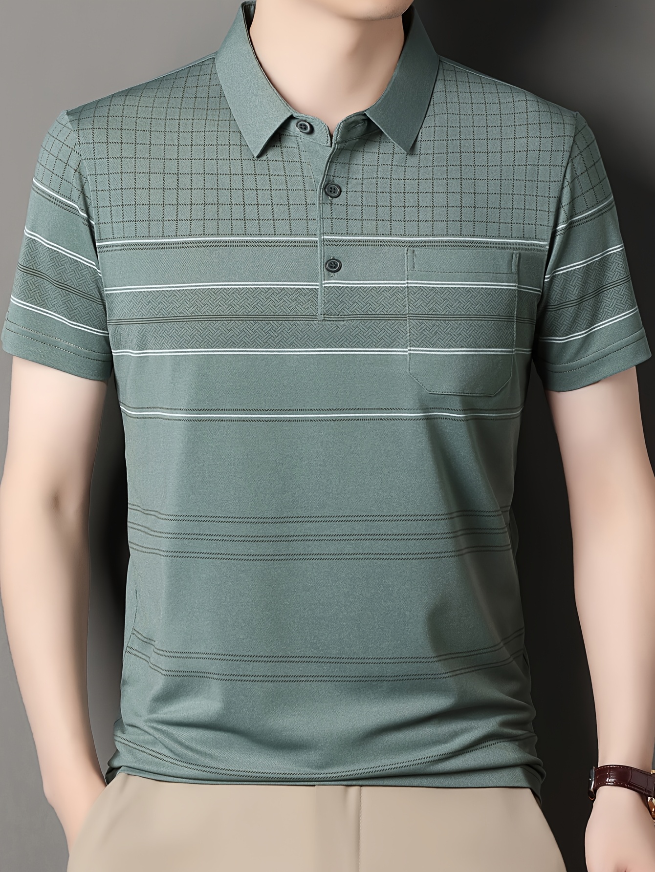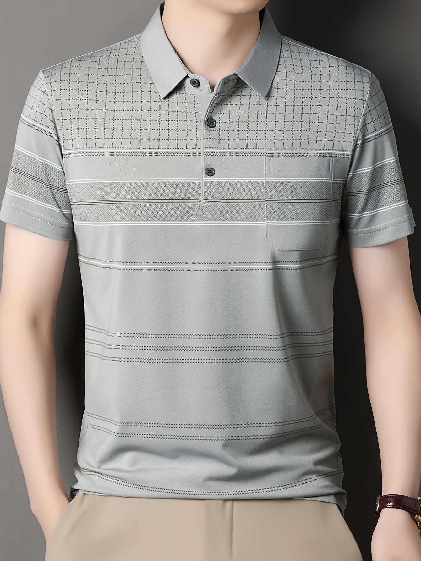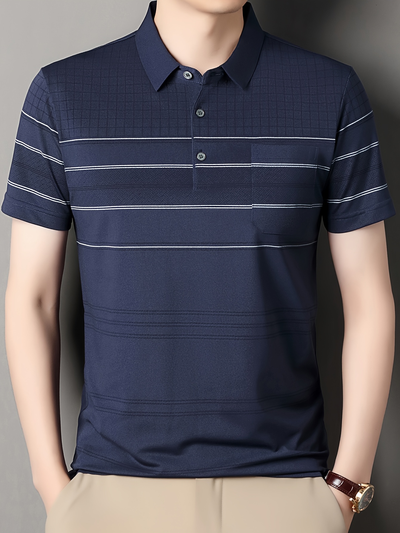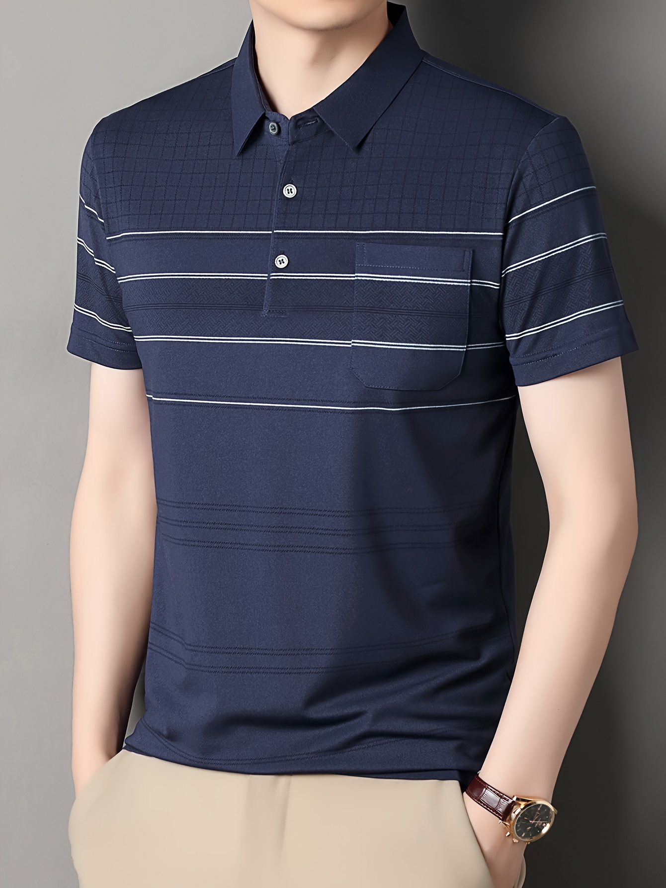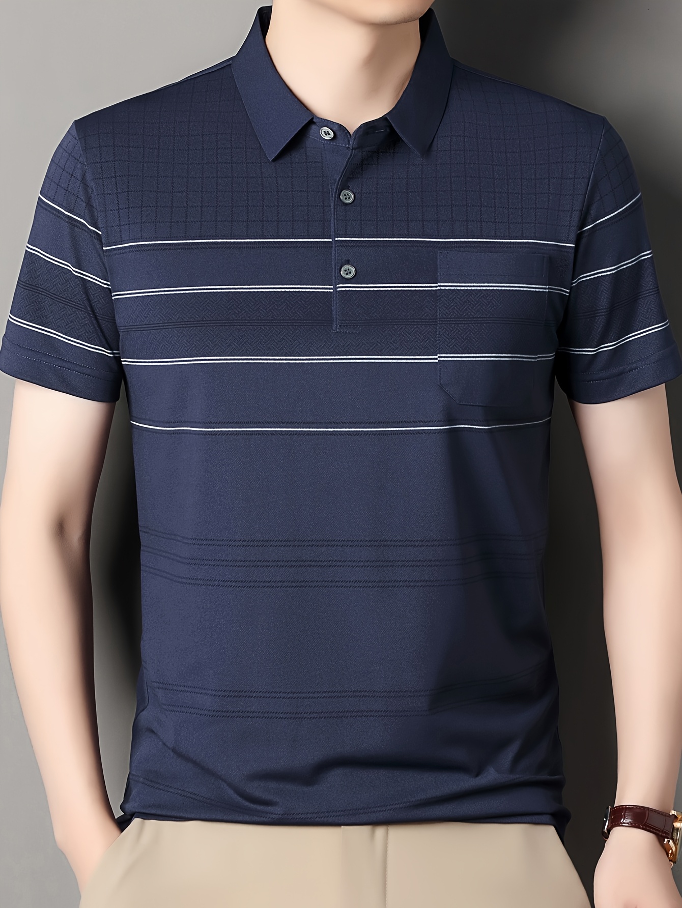 Men'S Summer Casual Short Sleeve T-Shirt with Pockets, Striped Pattern, Half Placket Lapel Collar, Regular Fit - Ideal for Work and Casual Attire, Work Uniform|Short Sleeve Shirt|Sleek Look