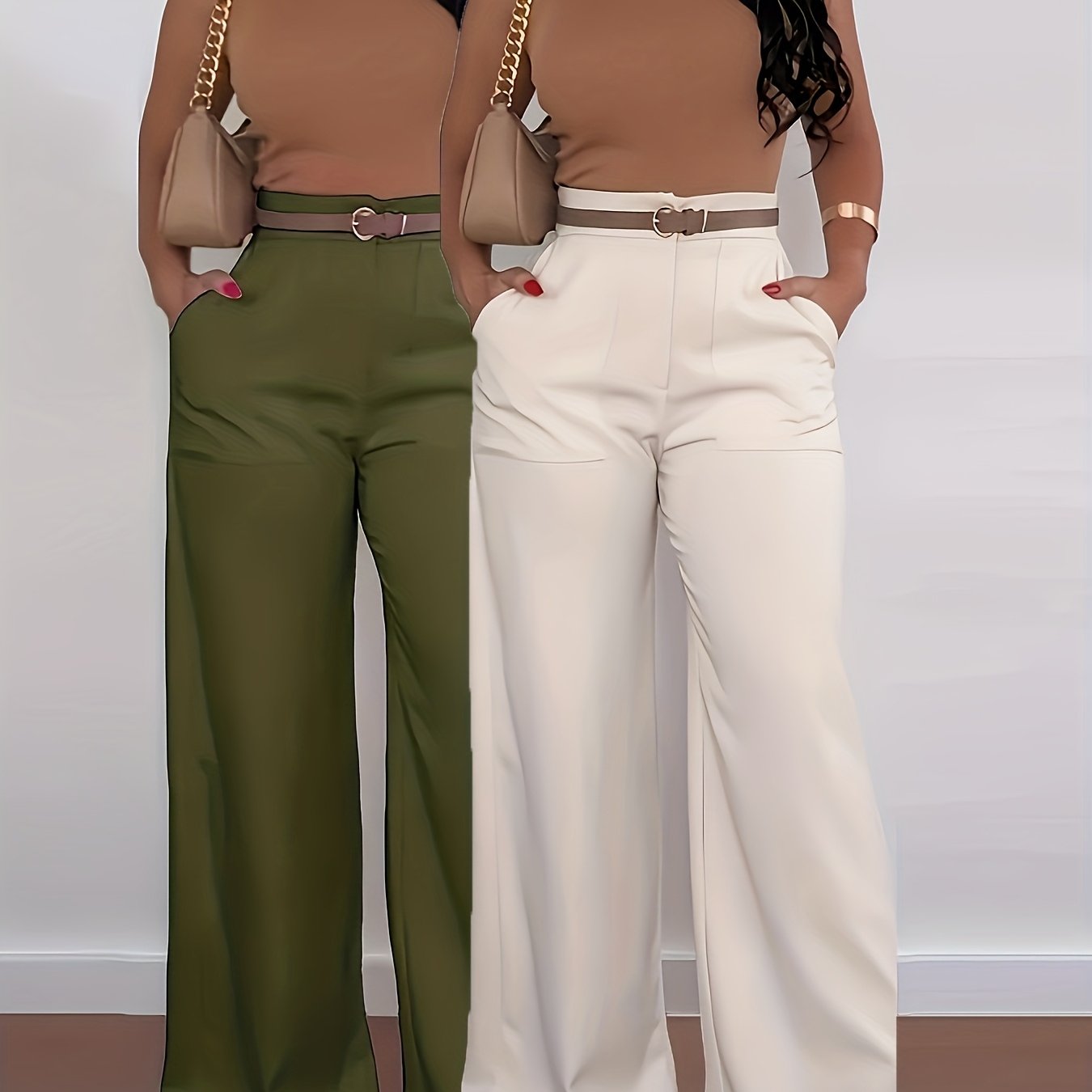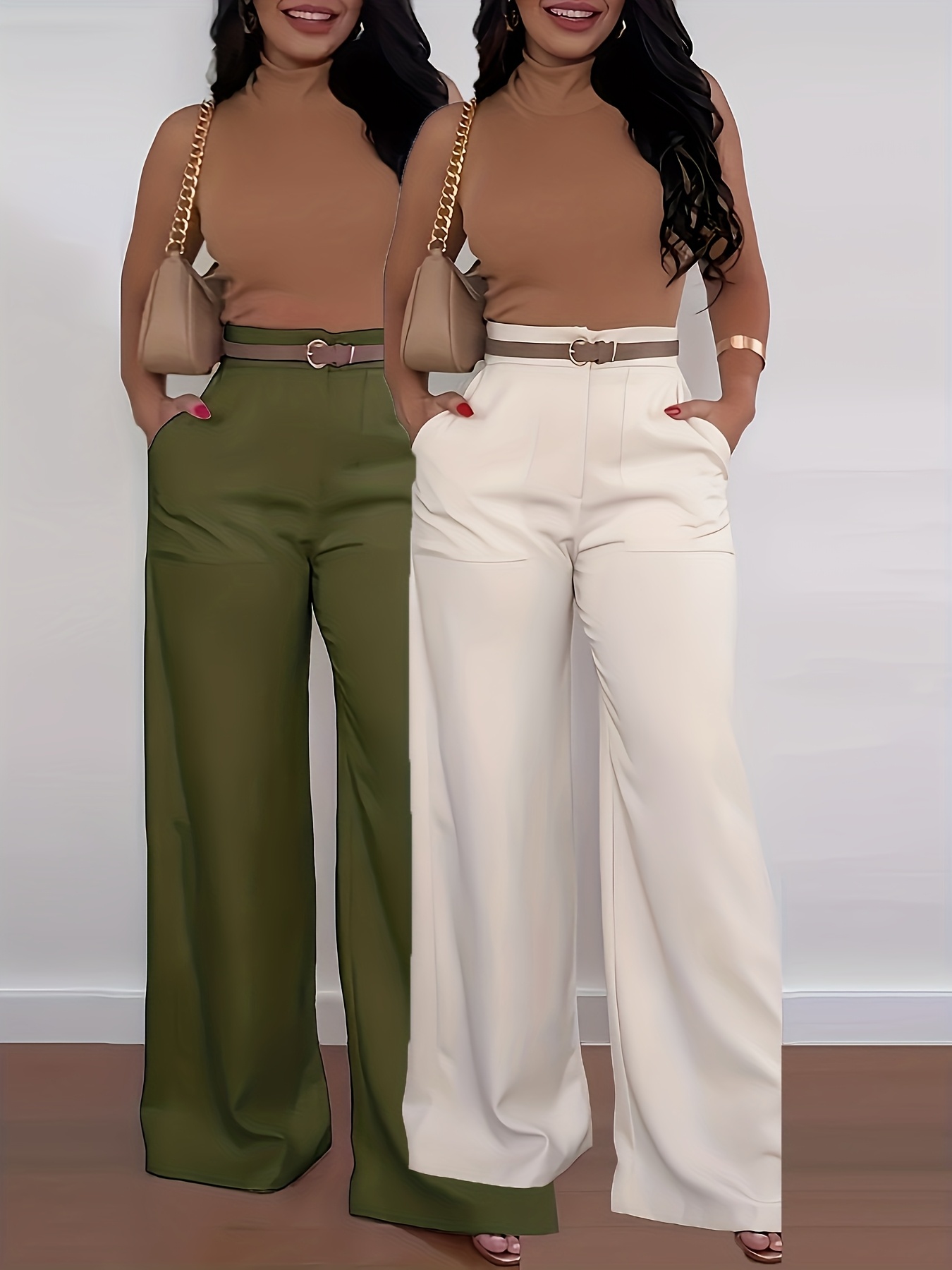 Lot de 2 Pantalons Femme Grande Taille – Cargo Élégants Jambe Large, Taille Haute, Sans Ceinture, Couleur Unie