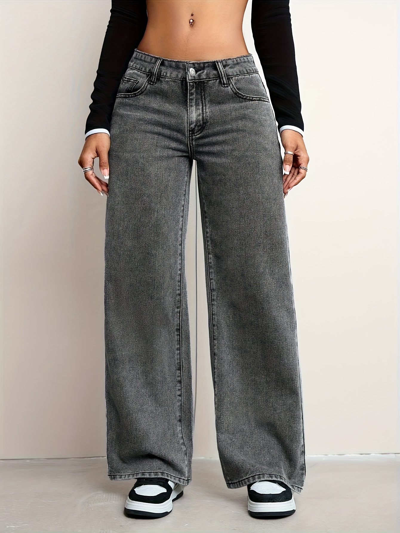 Pantalon Femme Décontracté Jambe Droite Denim Taille Haute Boutons Zippé Confort Toute Saison Couleur Unie