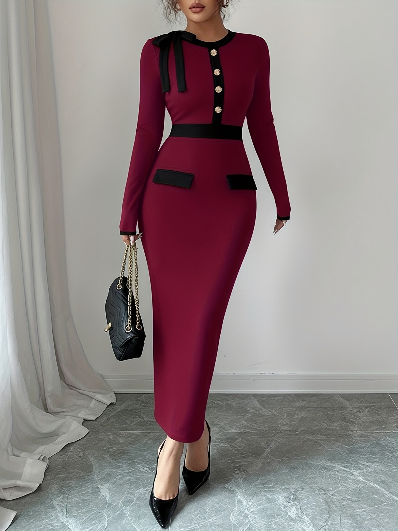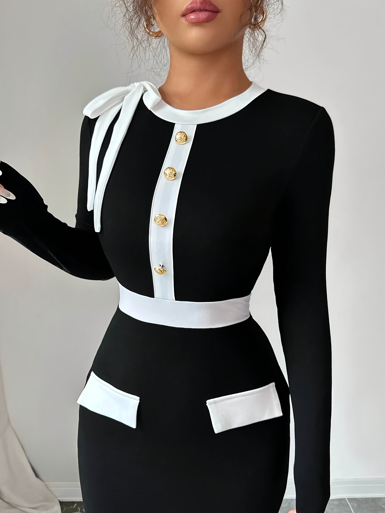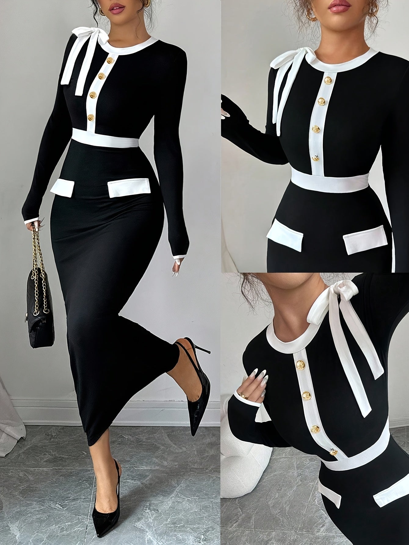 Women's Elegant A-Line Dress with Bow & Button Neckline - Black & White Contrast Long Sleeve Wedding Guest Dress, Church Dress, Year-Round Wear - Machine Washable A-Line Silhouette for Parties & Special Occasions (s)