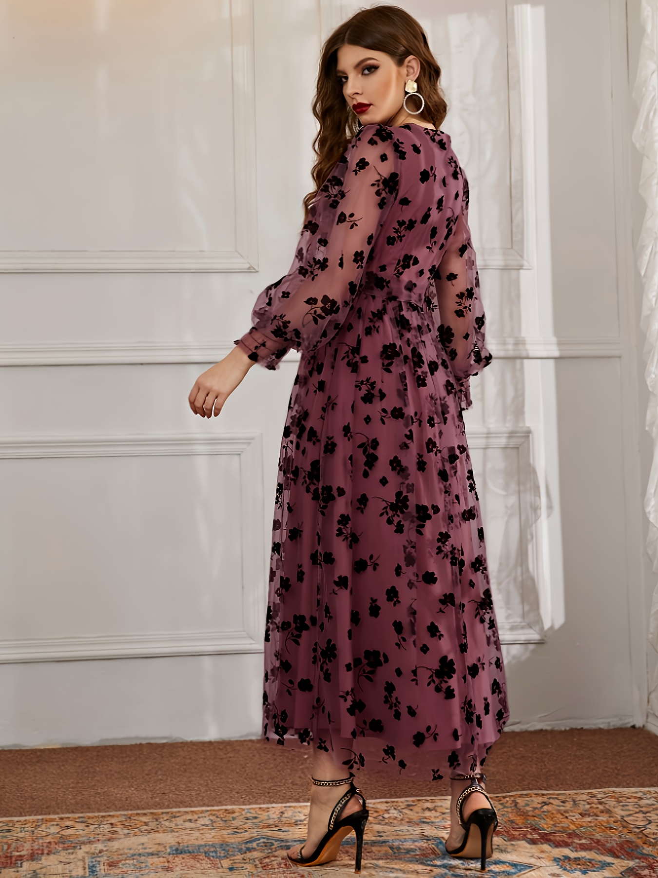 Robe Maxi Femme Élégante à Imprimé Floral – Coupe A-Line Fluide, Robe Formelle et Décontractée avec Ceinture Cintrante à la Taille, Manches Longues, Parfaite pour Mariages, Fêtes et Tenues Quotidiennes