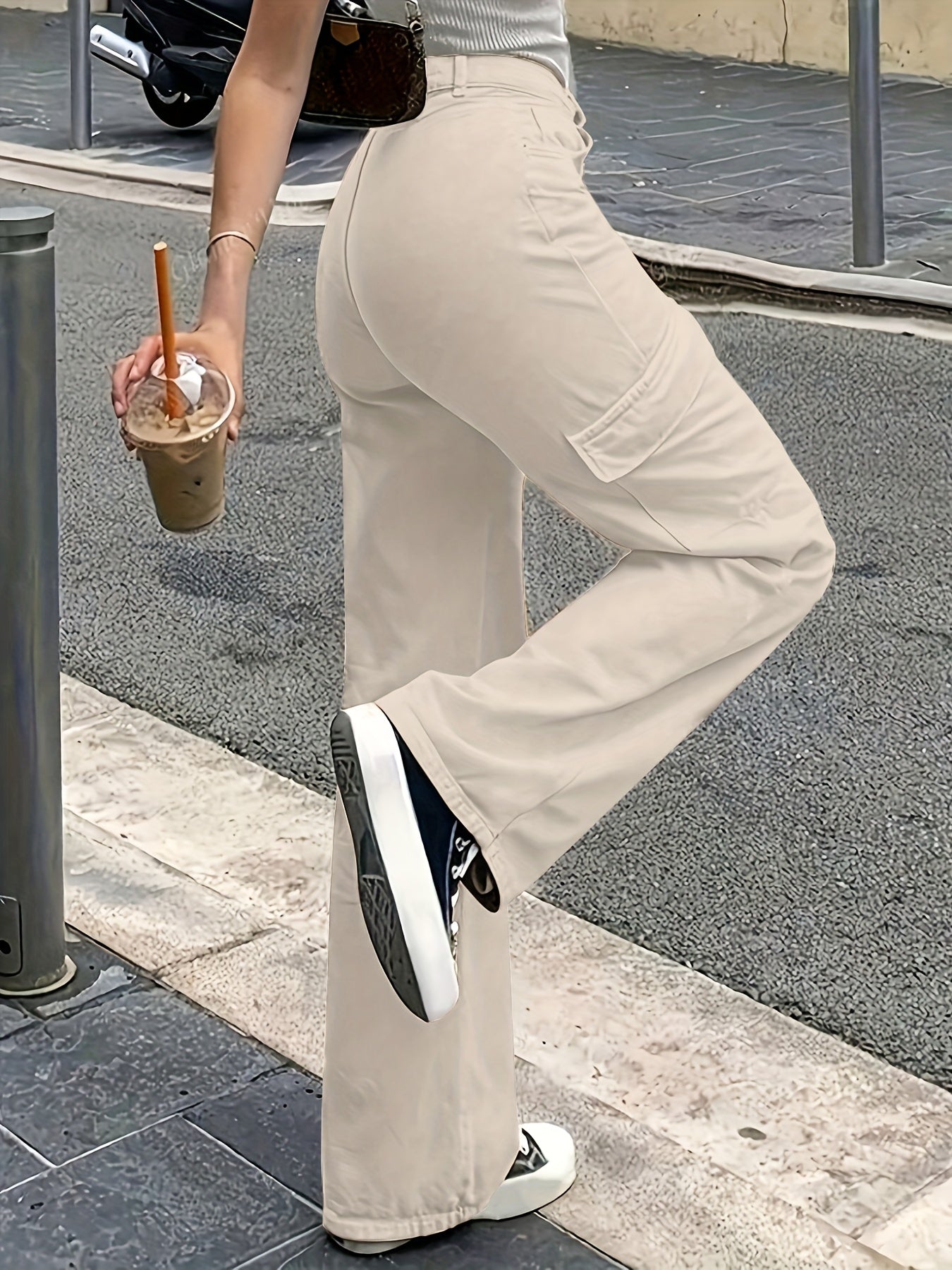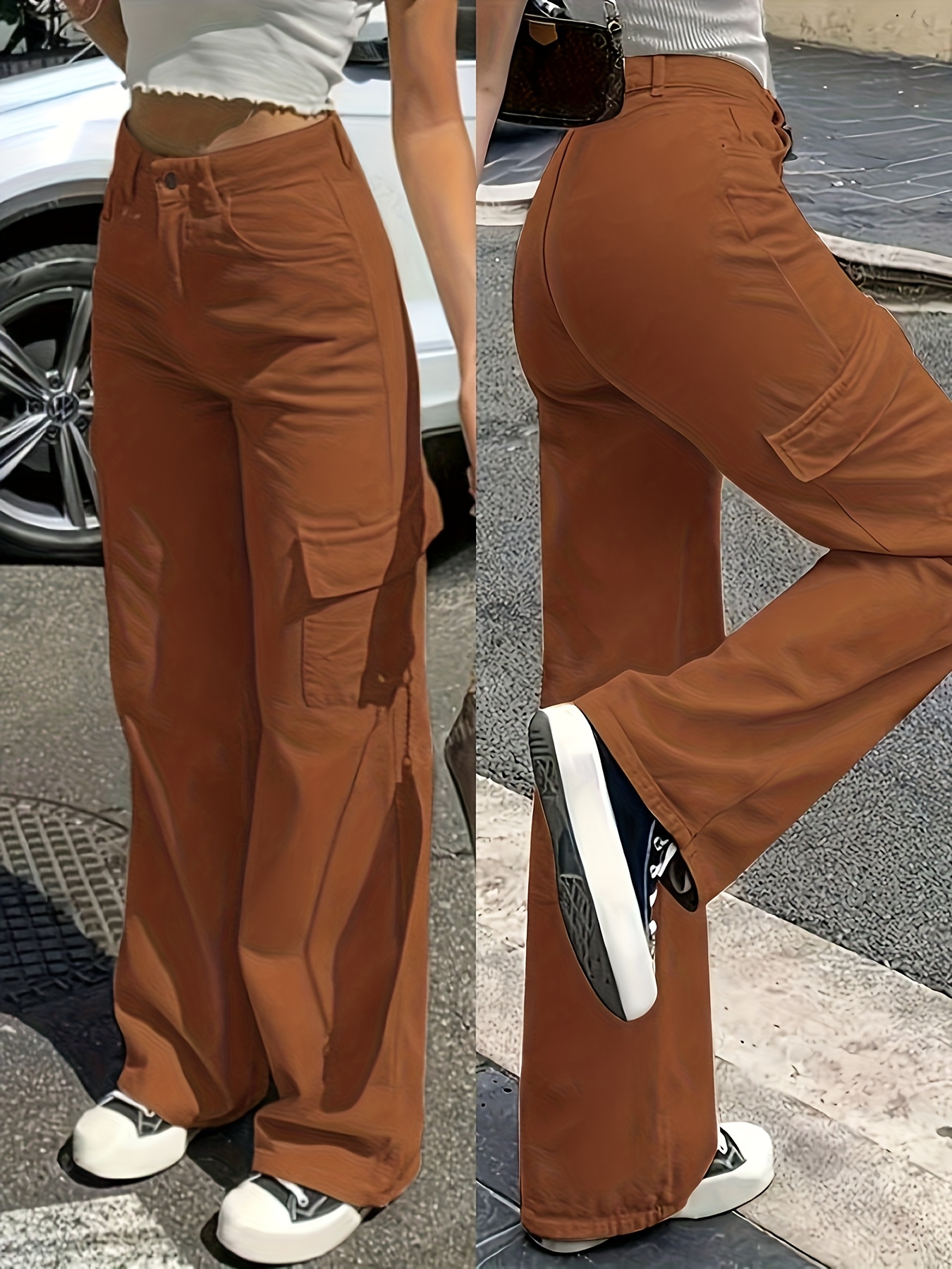Pantalon Cargo Femme Taille Haute – Jambe Large avec Boutons, Tous Saisons