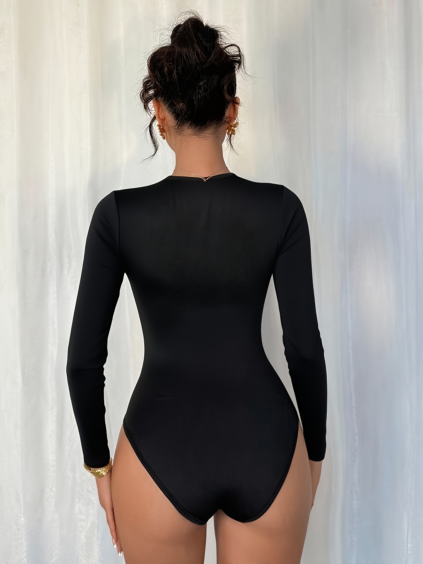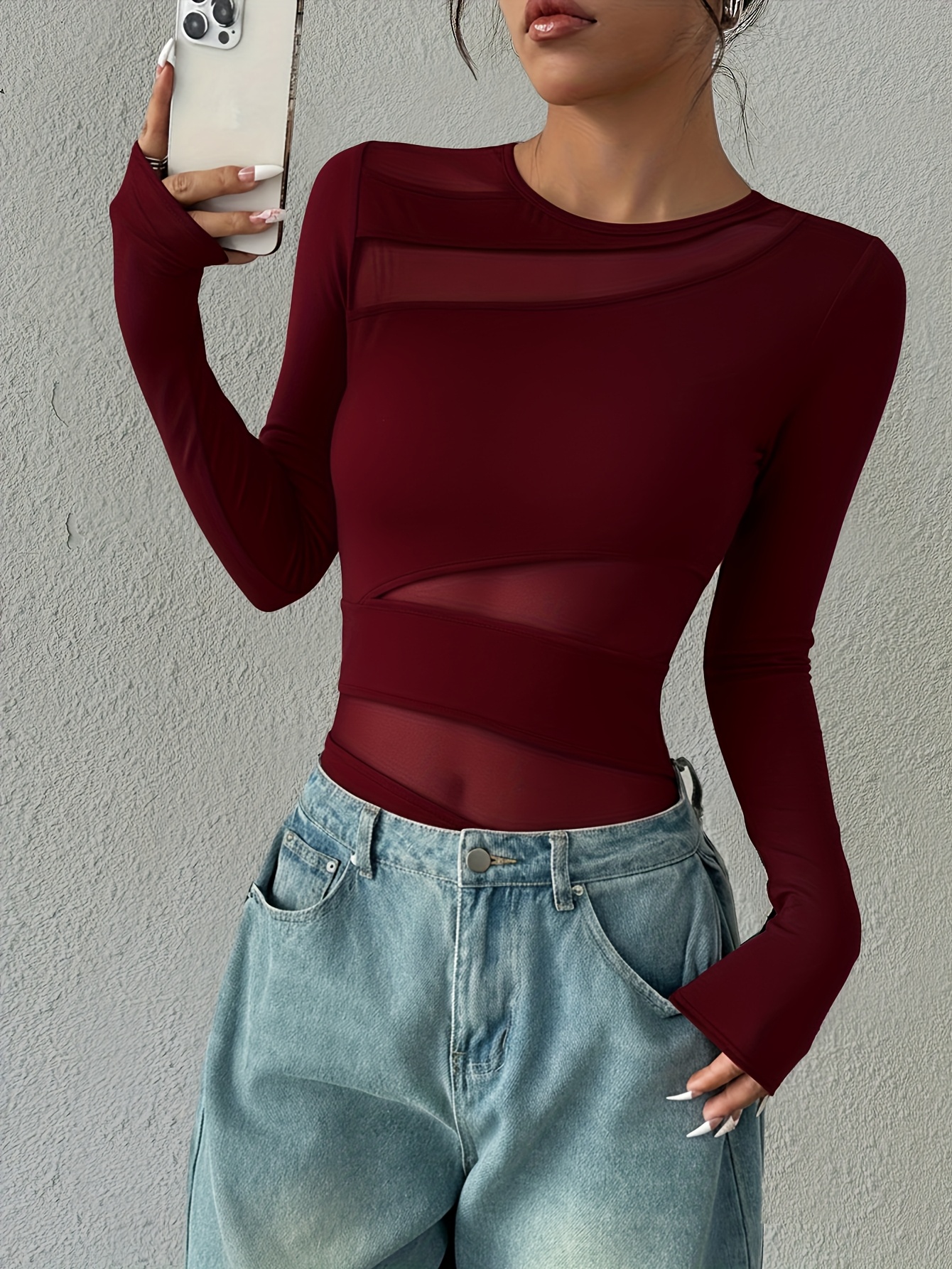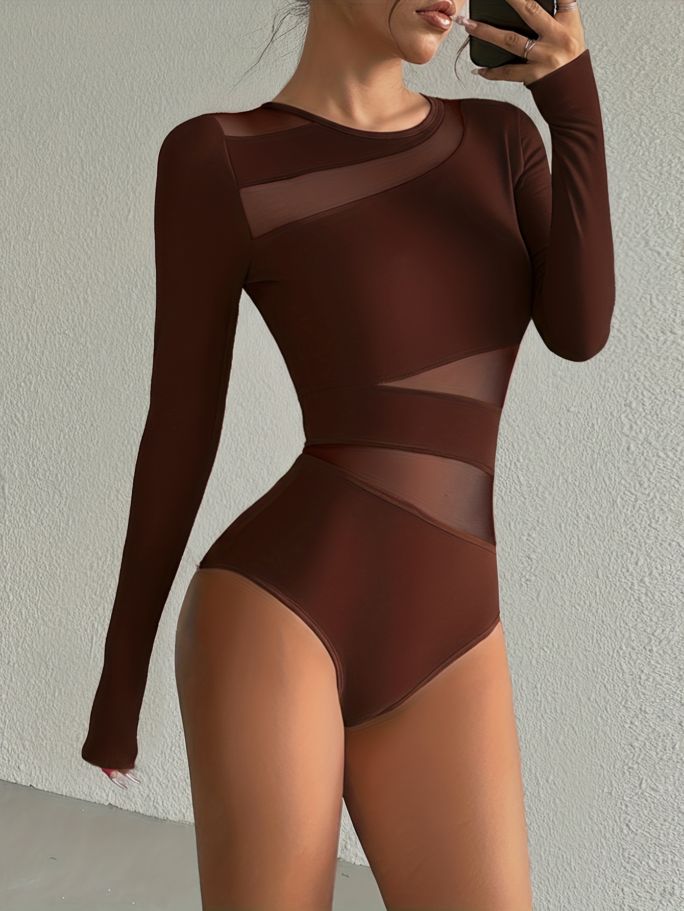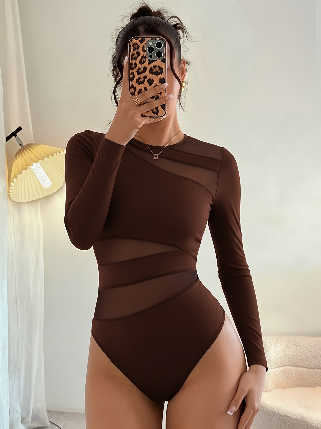 Combinaison Femme Sexy Hiver – Manches Longues, Body avec Panneaux en Mesh et Col, Fermeture Boutons Sombre, Tunique Extensible Couleur Unie Marron/Beige, Lavable en Machine, Idéal Soirées ou Tenue Décontractée
