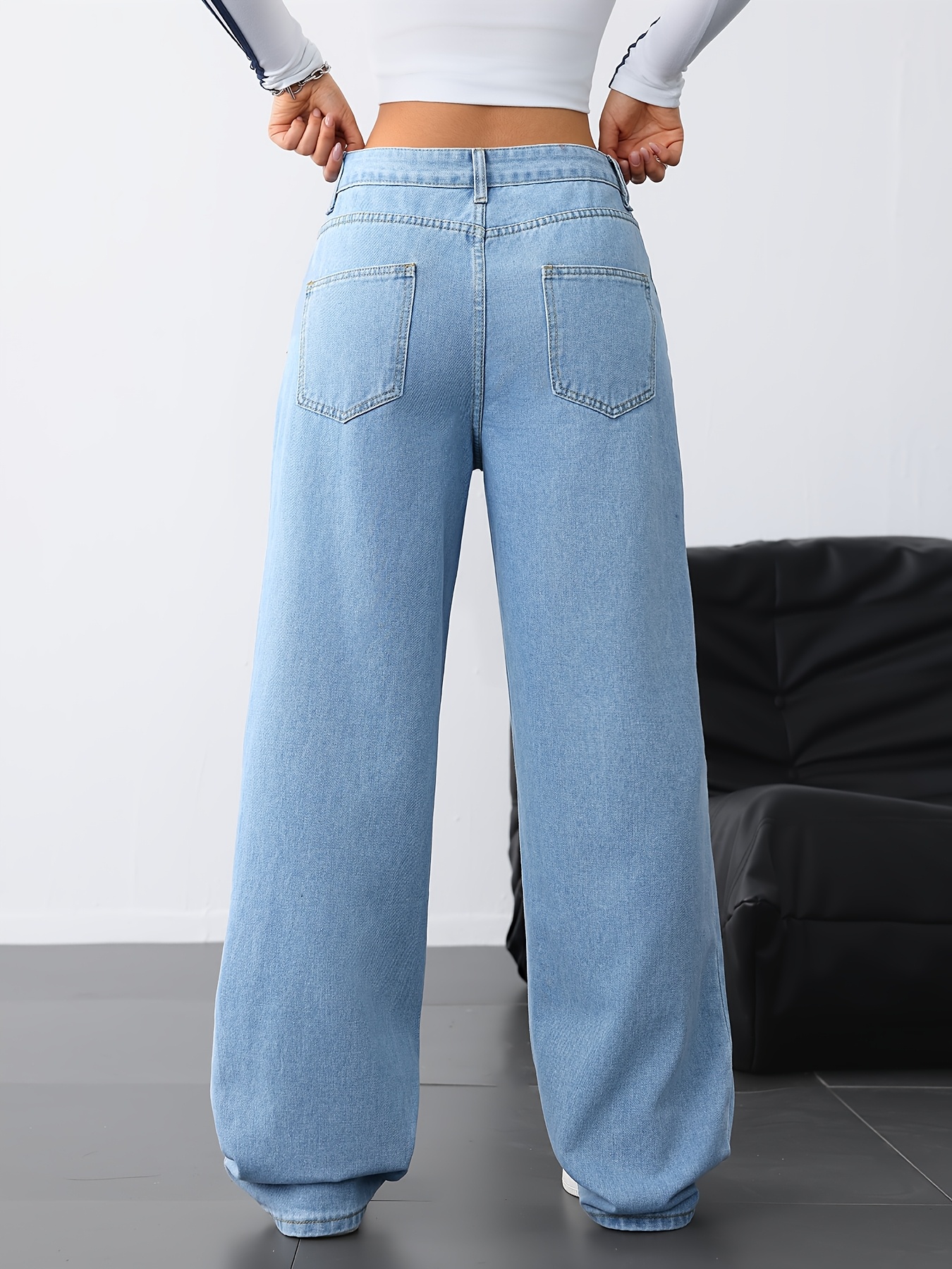 Jeans Femme Jambe Droite Bleu Clair Denim Effet Usé Non Extensible Toute Saison Décontracté Streetwear