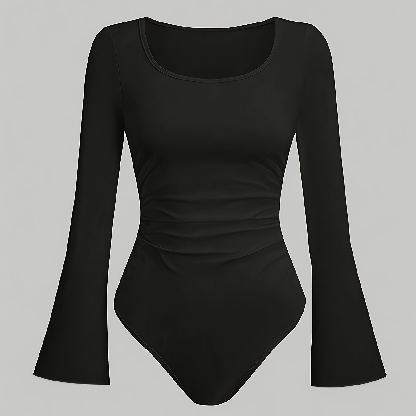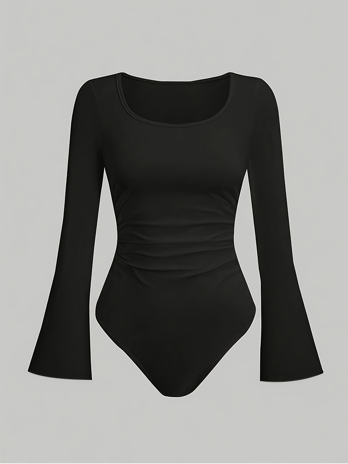 Body noir femme style Y2K à manches évasées. Coupe ajustée, manches longues, col rond. Tissu extensible en mélange de polyester, idéal pour un look décontracté ou de soirée.